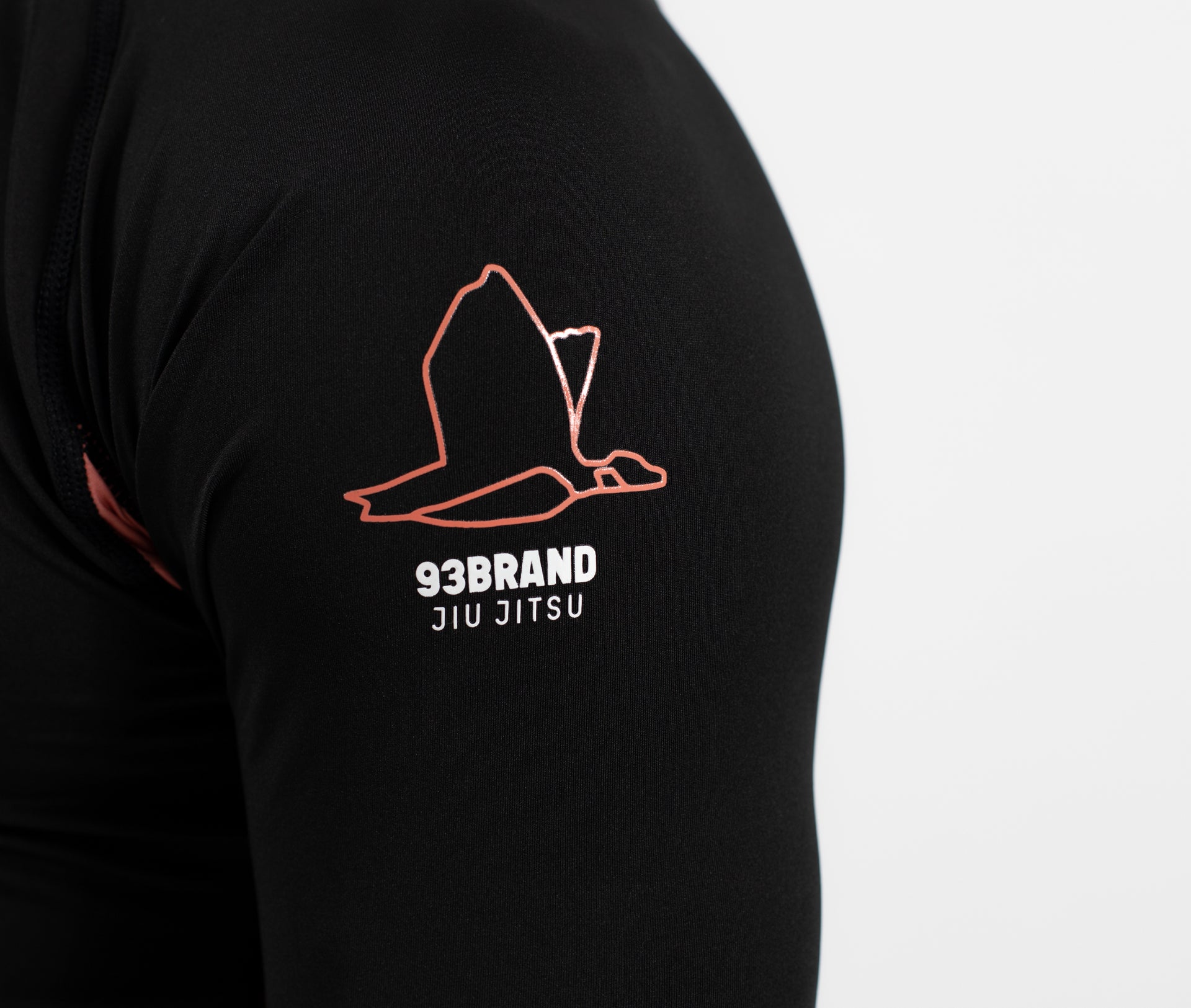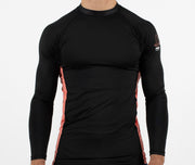 Set includes one burgundy/brick rashguard and one black/orange rashguard.