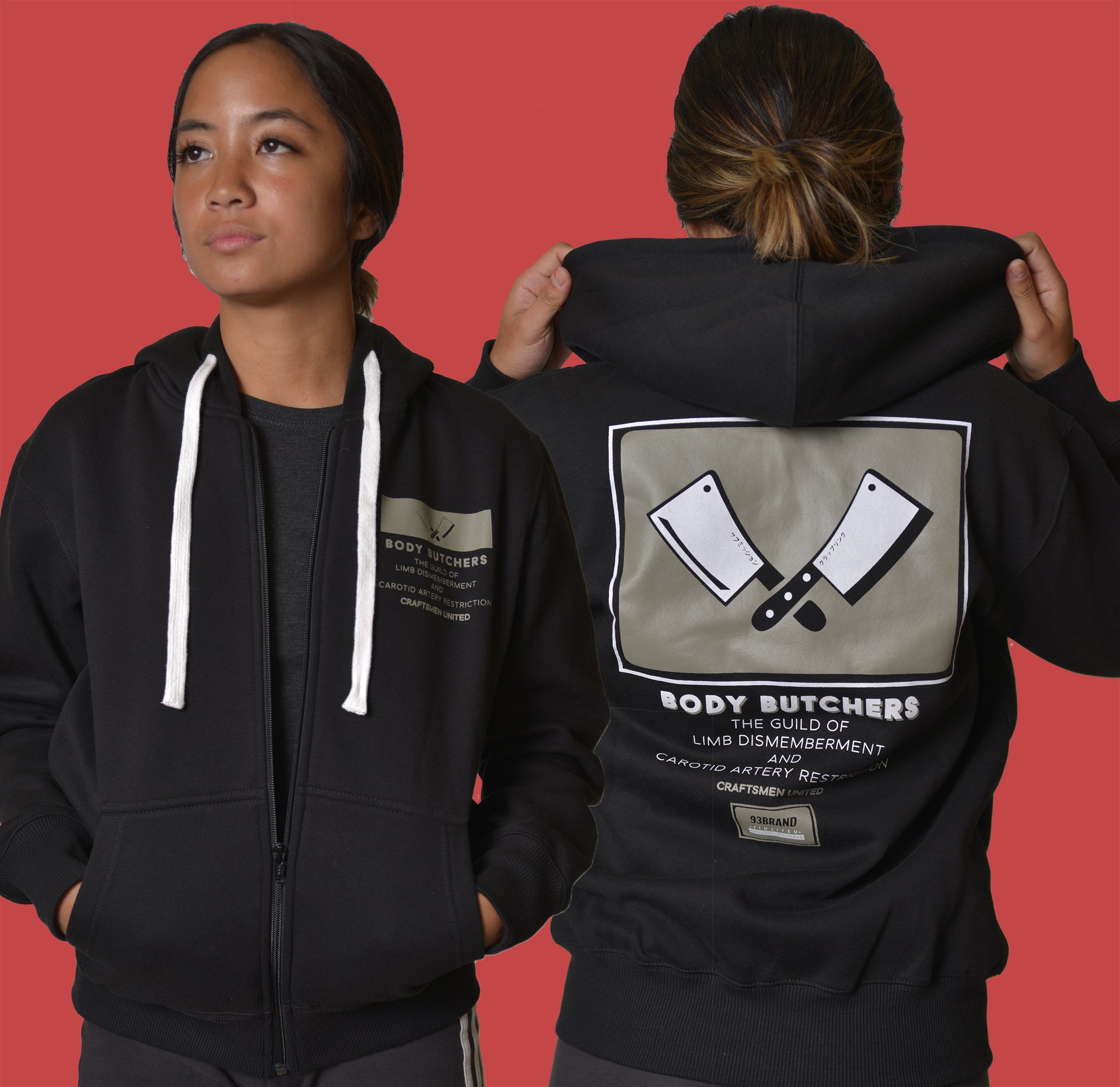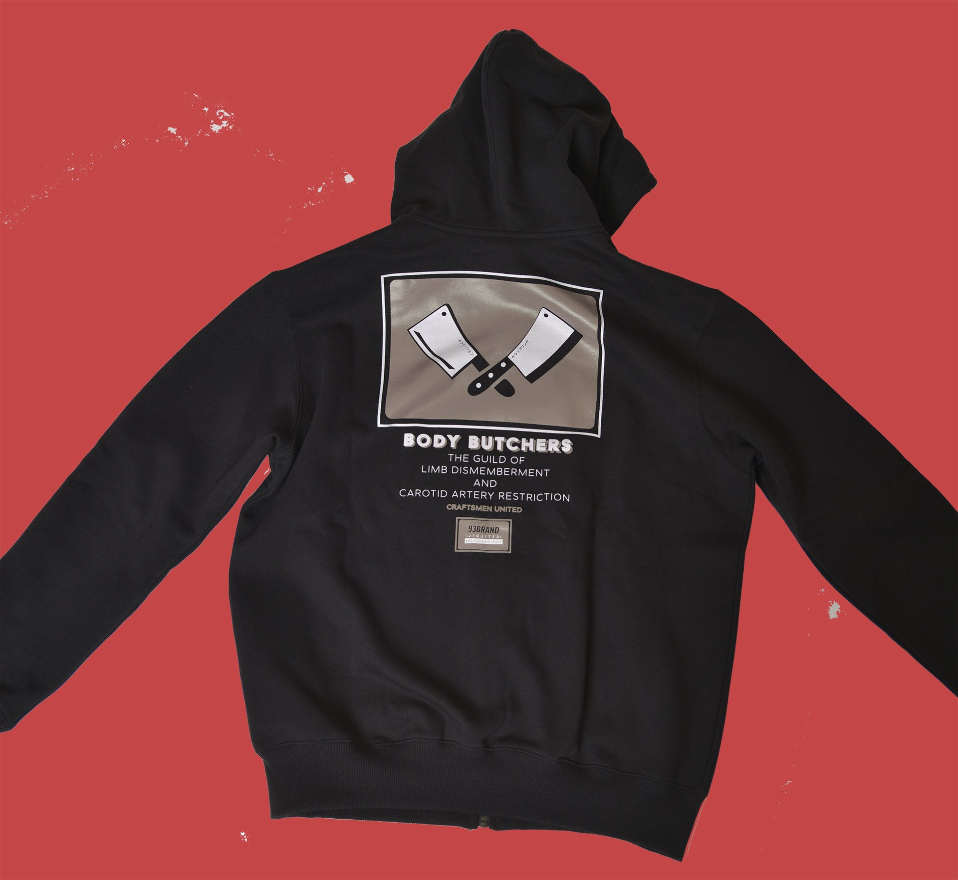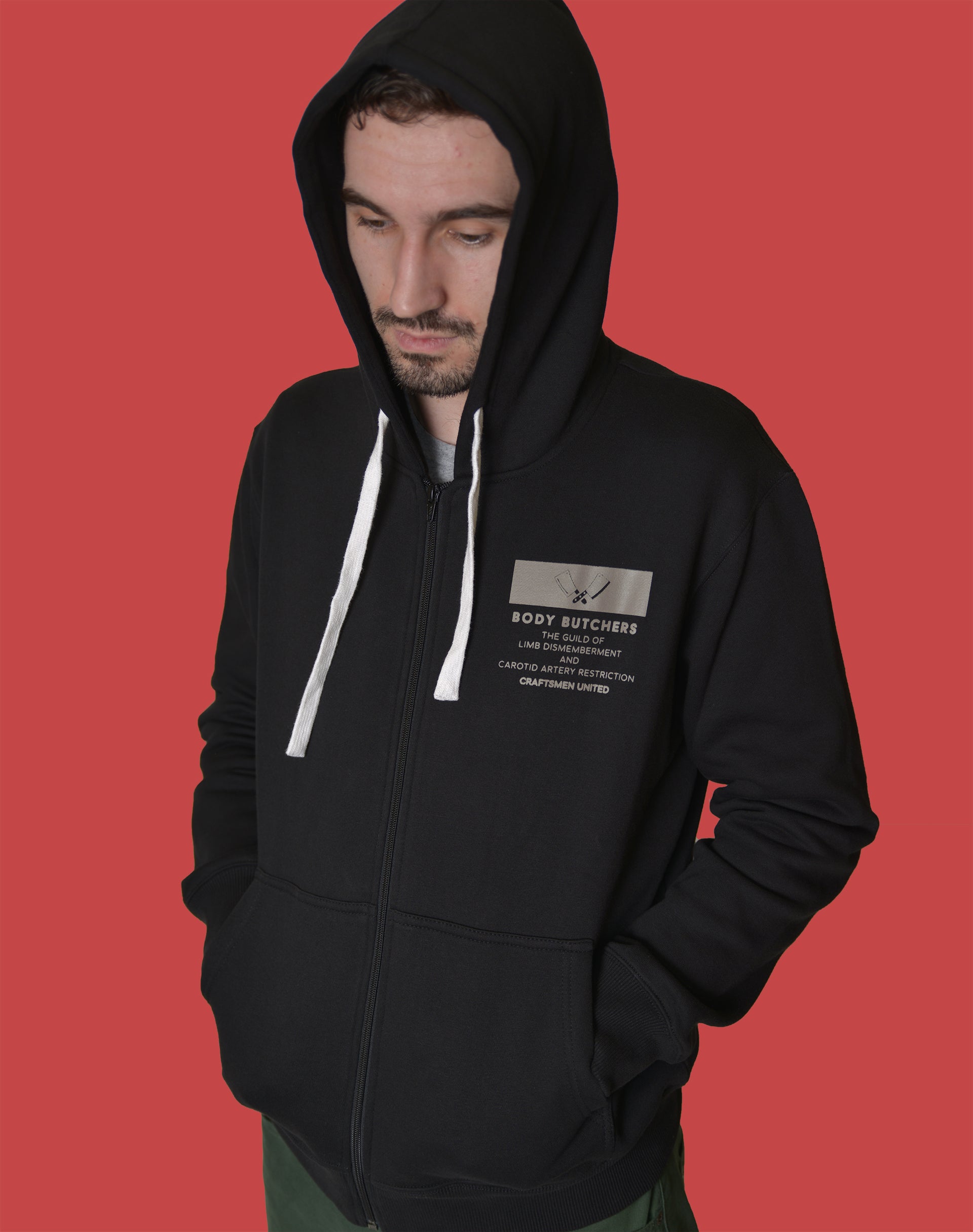 Heavier weight zip-up hoodie, featuring quality screens from the popular Body Butchers series. Faded tan and white prints on black cotton. Ribbed cuffs and hem. Sturdy black zips and adjust drawstring hoodie. Double-layer hood with plenty of room so you don't have to worry about your hood pulling tightly down on your head (I'm talking to you, tall folks and people with haircuts that you don't want squished).