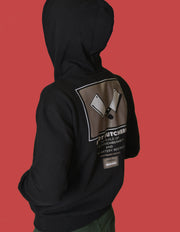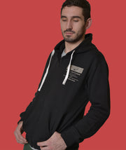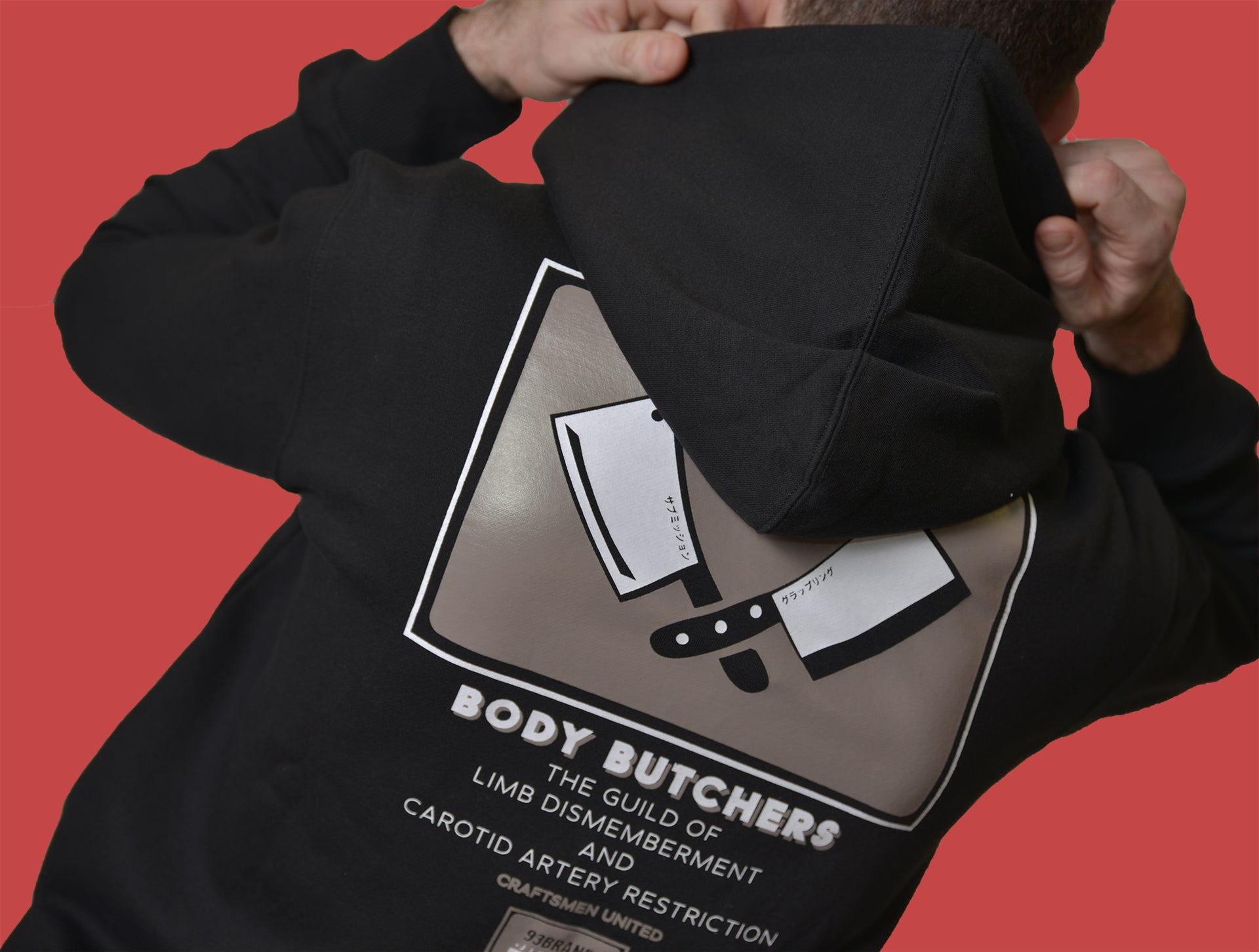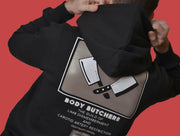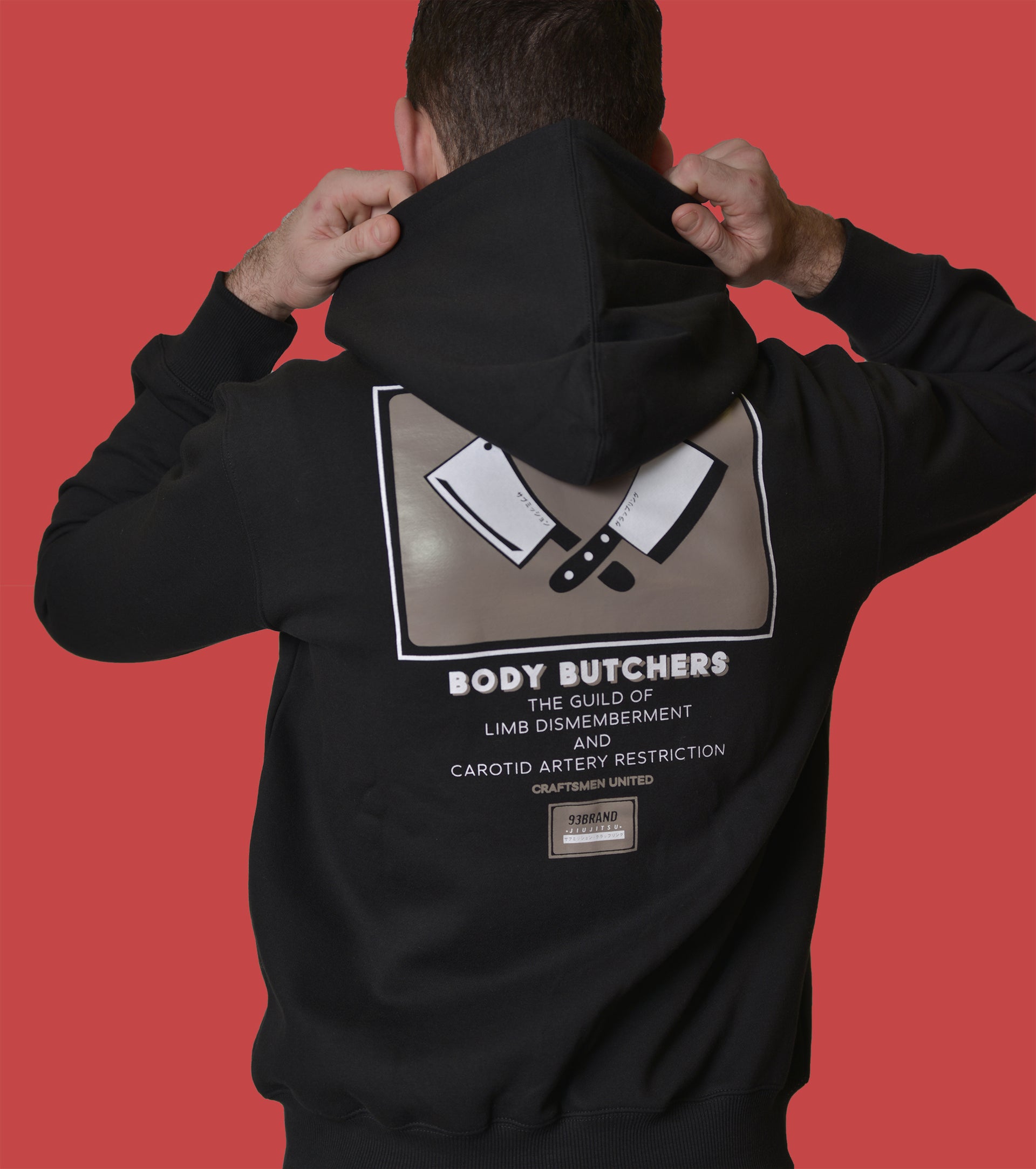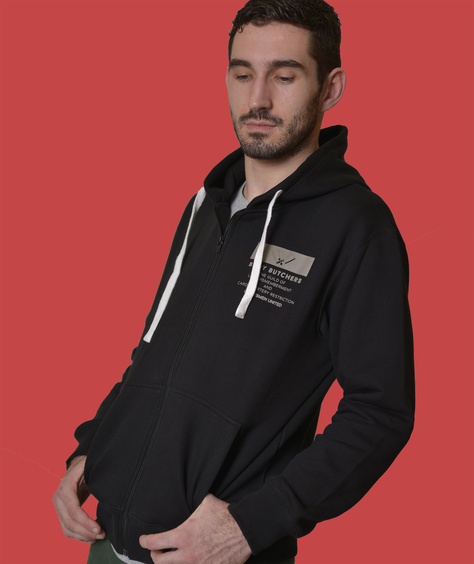 Heavier weight zip-up hoodie, featuring quality screens from the popular Body Butchers series. Faded tan and white prints on black cotton. Ribbed cuffs and hem. Sturdy black zips and adjust drawstring hoodie. Double-layer hood with plenty of room so you don't have to worry about your hood pulling tightly down on your head (I'm talking to you, tall folks and people with haircuts that you don't want squished).