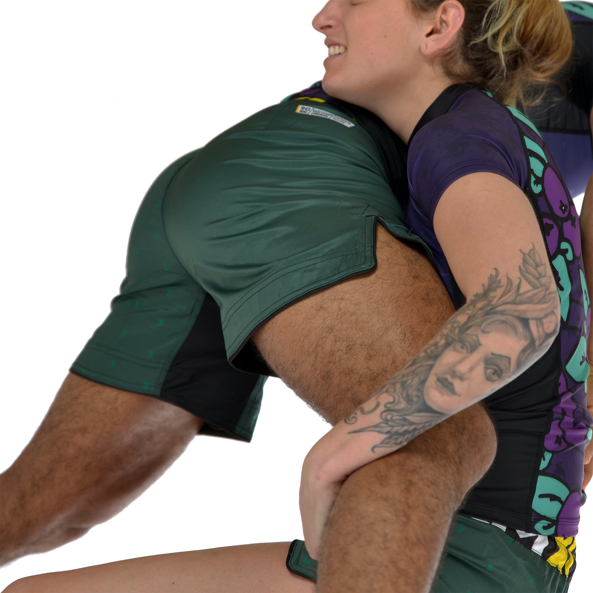 93 Brand has put together a soft and smooth polyester body that slightly hugs your legs in order to eliminate any excess material (gone are the days where your opponent's feet get caught in your loose board shorts). One continuous piece of stretch lycra is used for the crotch panel, from inseam to inseam. The benefit of using one piece is that is has no vulnerable seams and is flexible enough to accommodate all the splits, head kicks, and guard inversions that your hearts desire. Combined with the reinforced split side seams and lightweight stretch body, we're looking at a fit that can't be beat