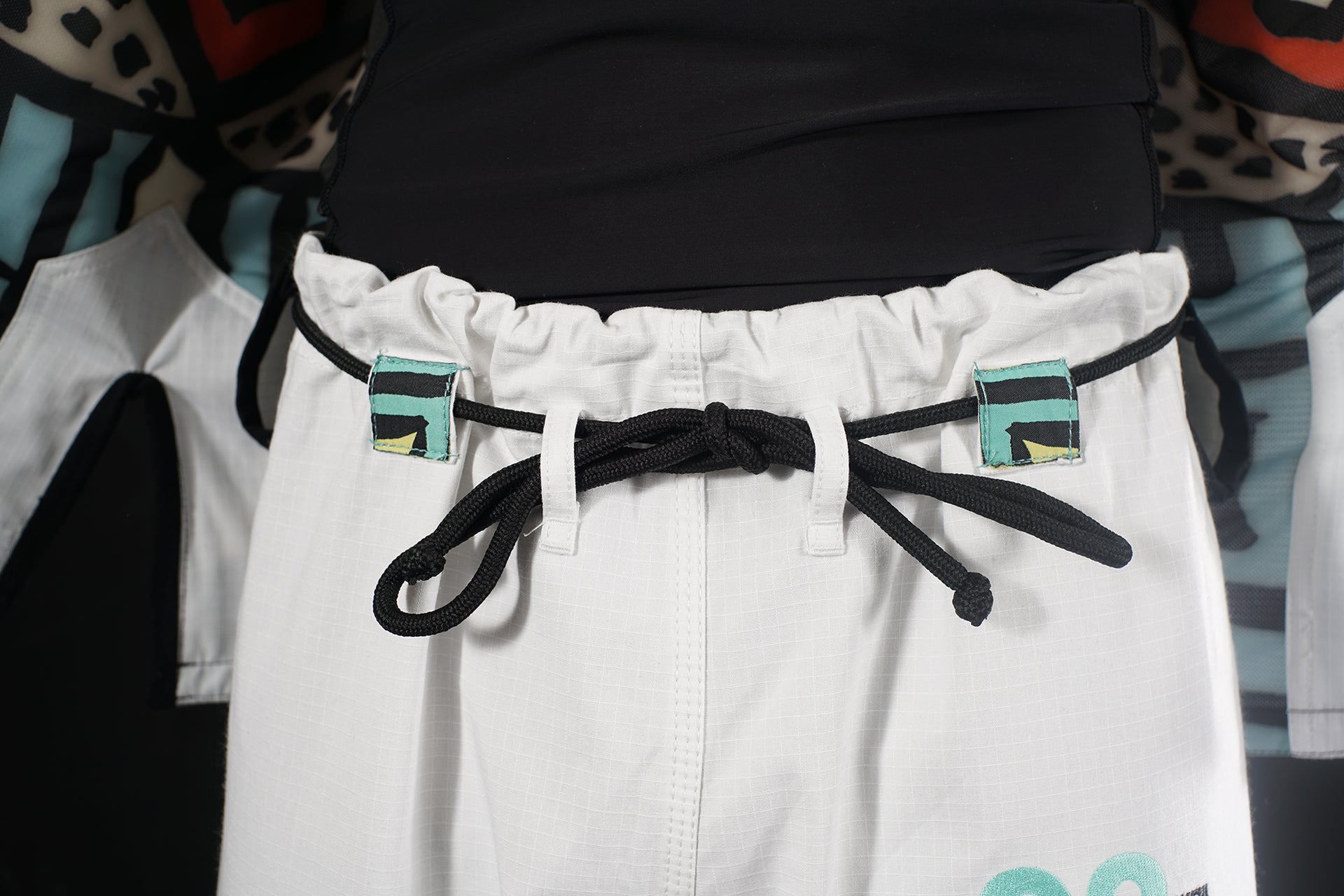 The hand-painted designs are showcased throughout the full jacket line, itself a soft mesh fabric that feels great against the skin without adding as much weight as a non-porous rashguard lining. The original pattern also is used for the thin jacket taping (rear jacket hem only) and pant loop framing.