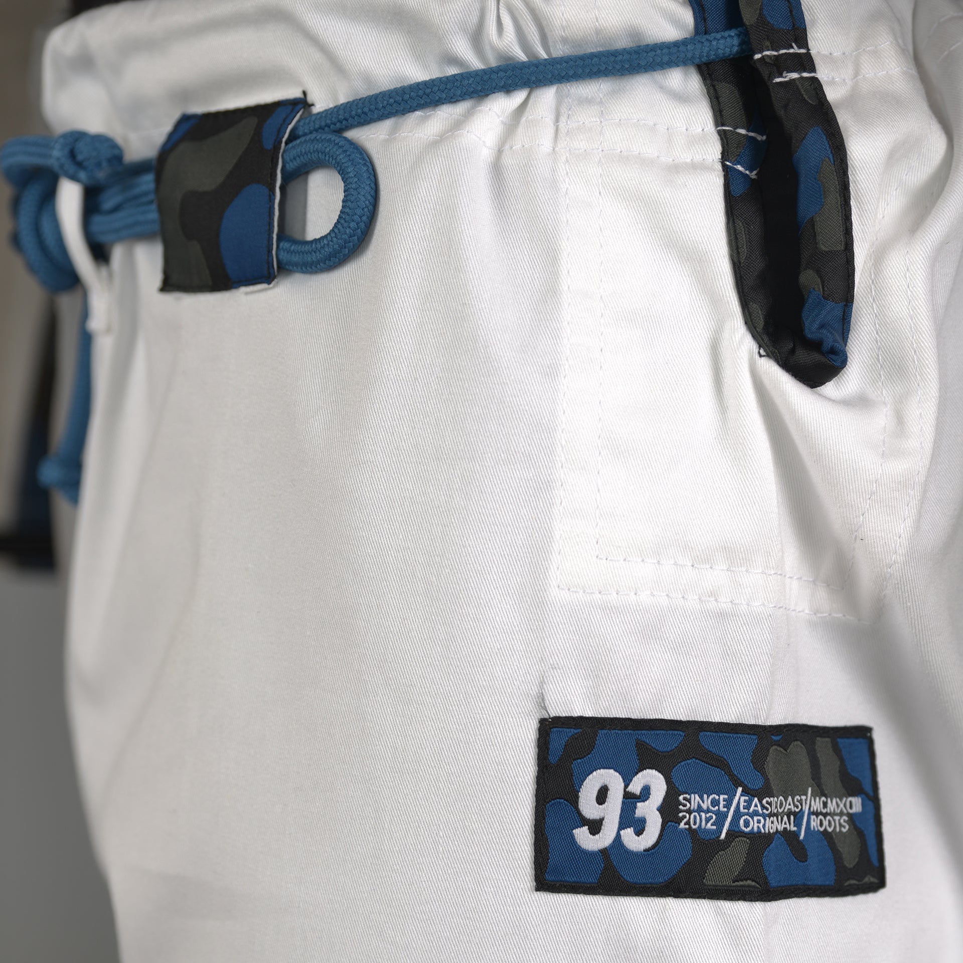 Killing 2 birds with 1 stone by using pattern artwork on the side vent fabric, pant loops, and interior panels, instead of adding additional patches. Arm embroideries have a hollow fill to keep things light. No contrast stitching, leaving a nice clean white finish. Plenty of room for academy or sponsor patches. Interior shoulder and vent reinforcements feature a sublimated blue/grey/black camo pattern.
