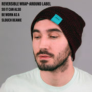 - Reversible wrap-around label allows you to un-cuff the edge and wear it as a slouch-style beanie as well