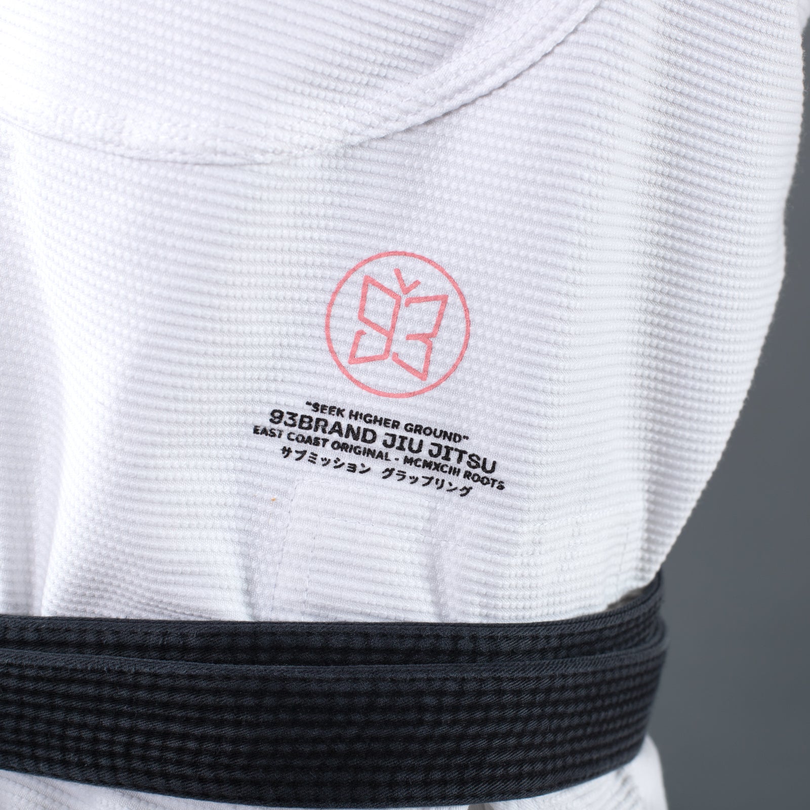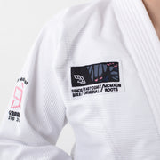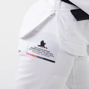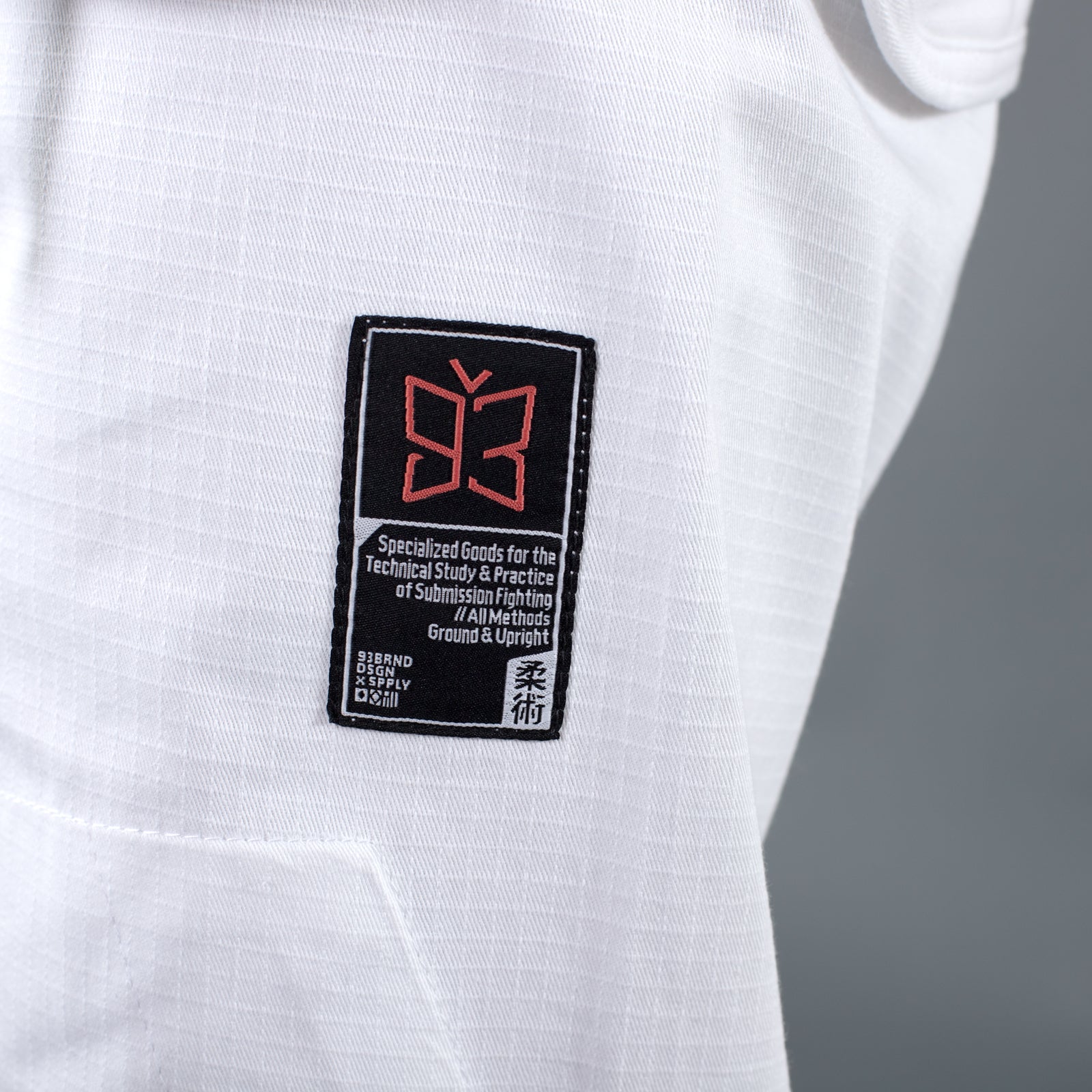 New white Gi based on our "C-SPEC" body style with several modifications to the typical BJJ Gi... aimed at improving the traditional kimono design in areas where Jiu Jitsu has evolved but the old school uniform has not. The main materials are 425 GSM Advanced Pearl Weave for the top, and a hybrid Twin Twill cotton weave bottoms.