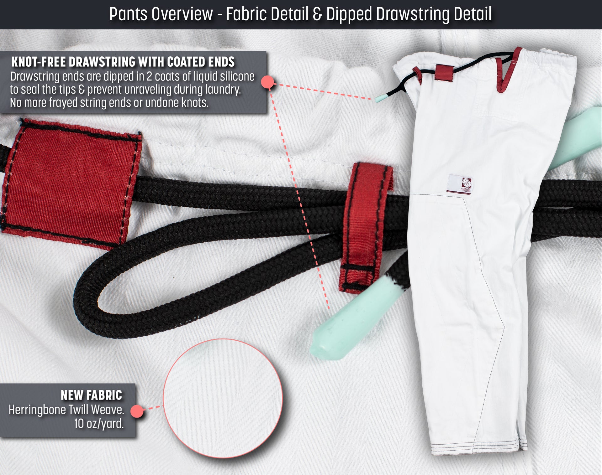 We all hate being stuck in a nasty Lapel Guard, so we've added a 2nd panel of Pearl Weave along the bottom of the skirt, along with slanting the ends of the lapel - the idea being to make the material harder to bunch up for grips, and the angle of the lapel ends making it harder for opponents to get a strong grip on the bottom of your lapels.