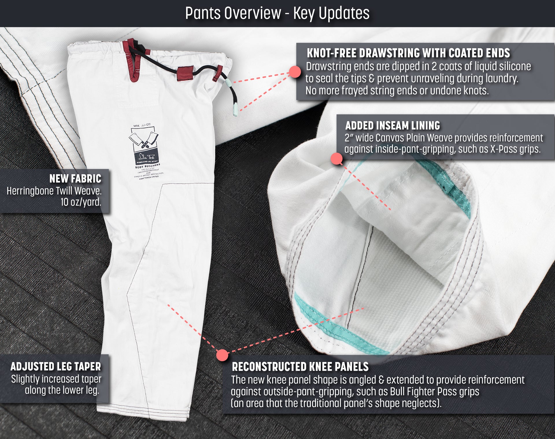 Inner leg grips are of course a big part of many passing styles, so we've also added a 2" wide strip along the pants' inseam to reinforce against unbreakable grips from a dangerous passer.