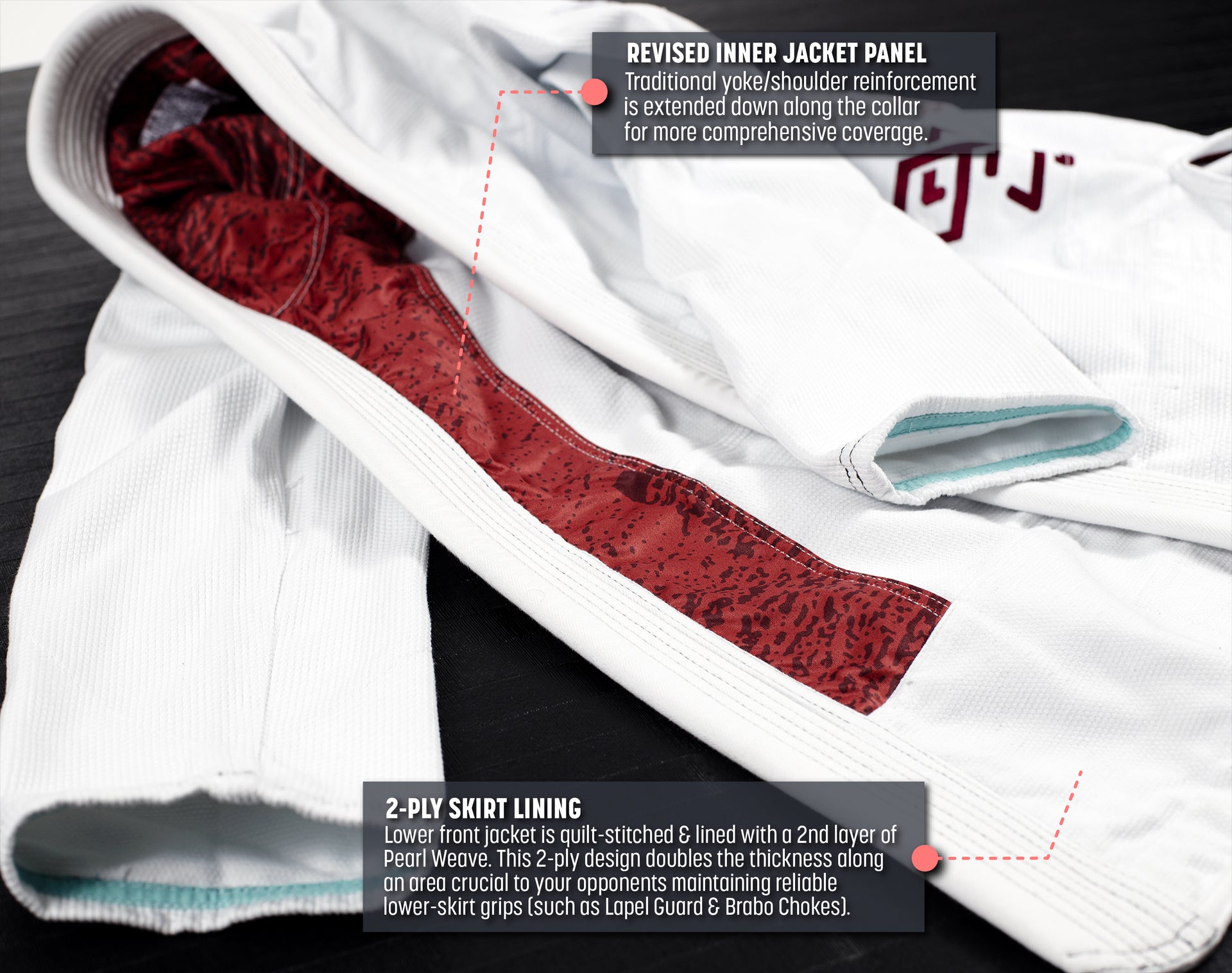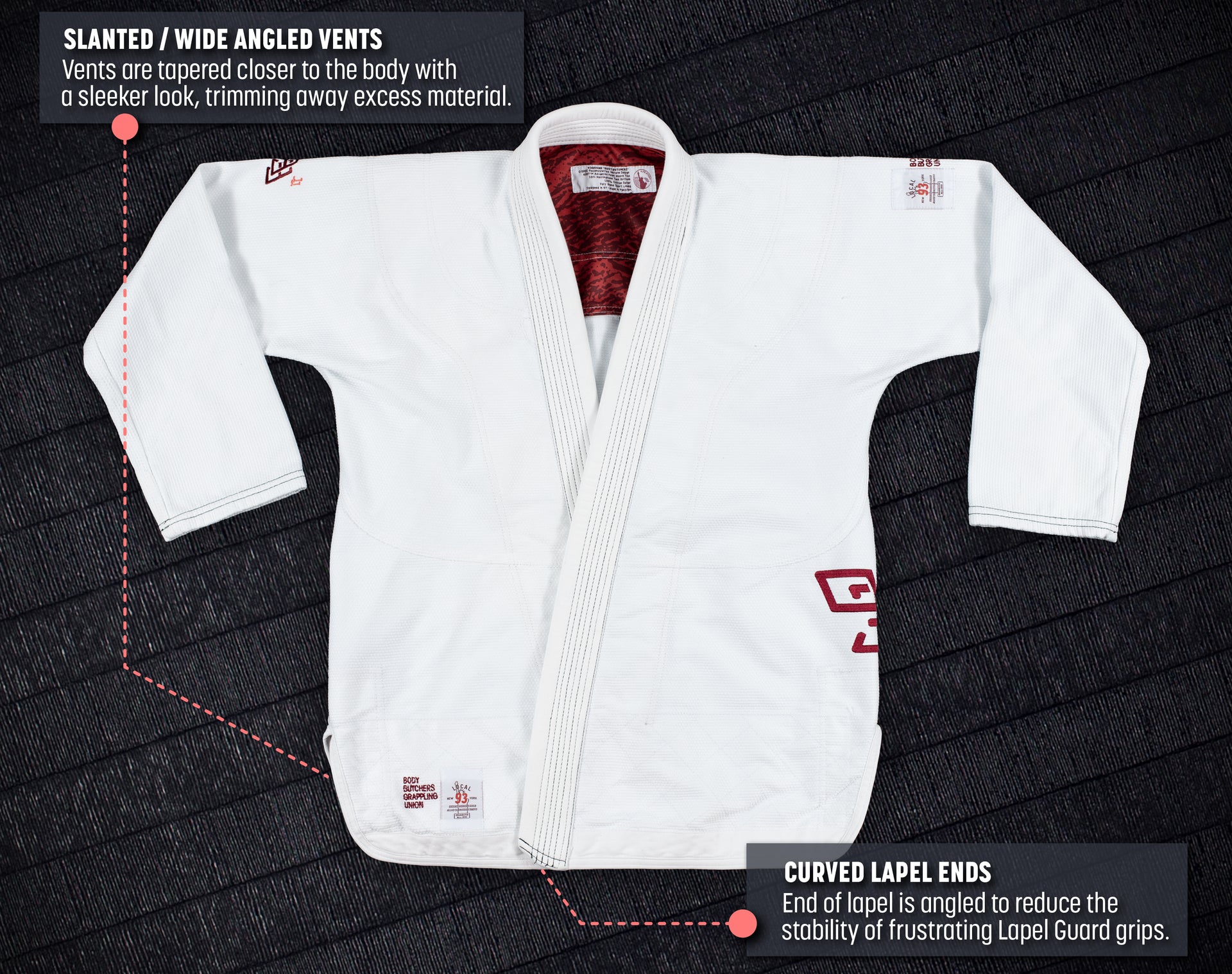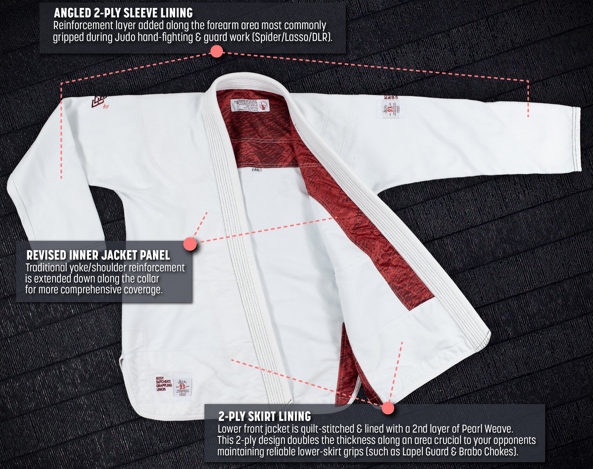 Our updated "C-SPEC" construction introduces quite a few improvements to accommodate the modern Gi style of Jiu Jitsu. We've re-shaped certain panels to address certain short-comings of the traditional BJJ Gi design, and we've added two-ply paneling along strategic areas in order to make it less likely your opponent keeps an frustratingly strong grip (curse you, lapel guard!)