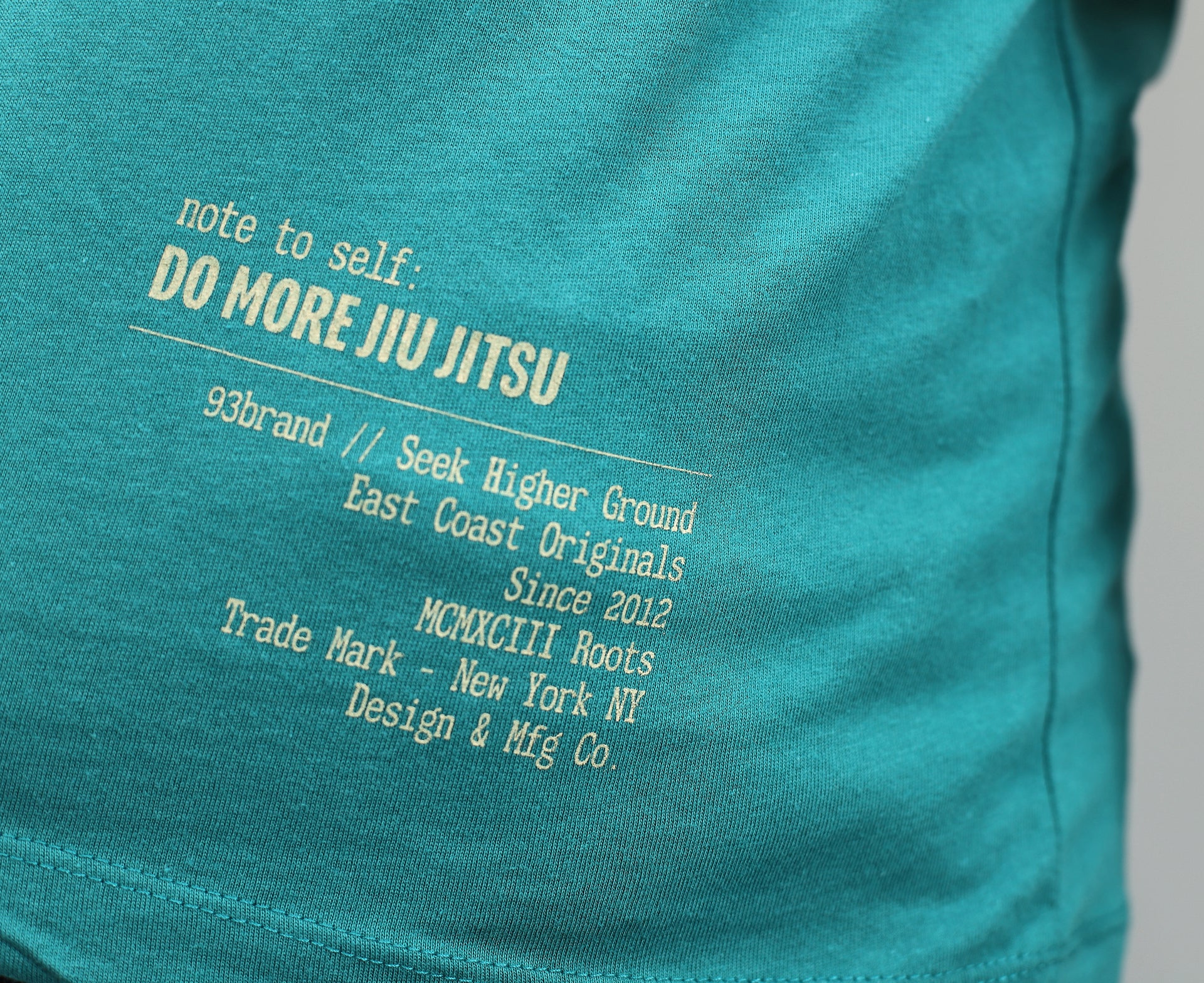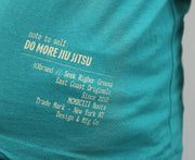 - Low hand-feel screen prints (emblem on right chest and accent color "Do More Jiu Jitsu" type on rear corner)