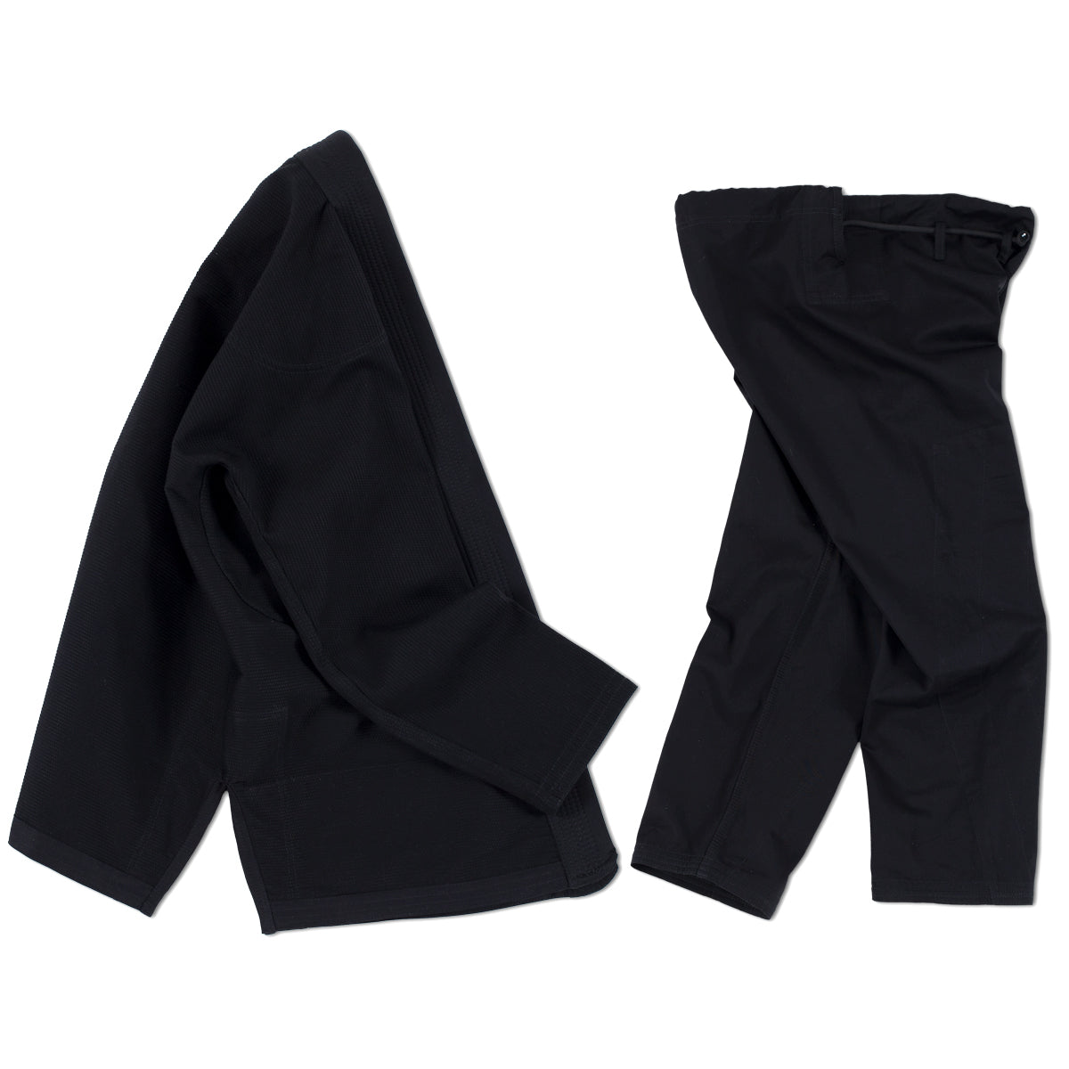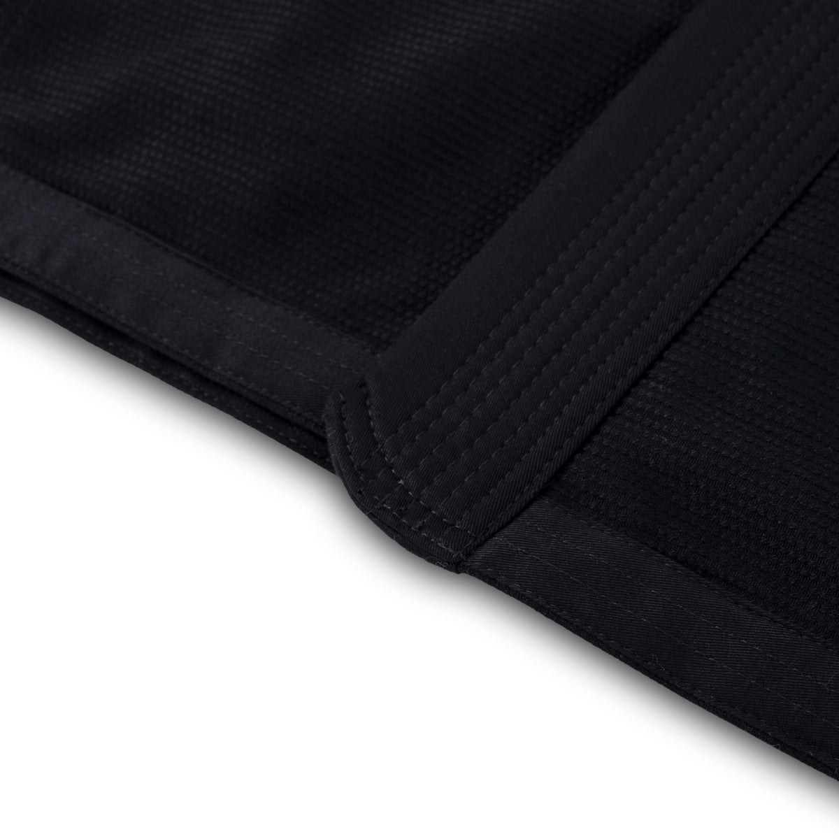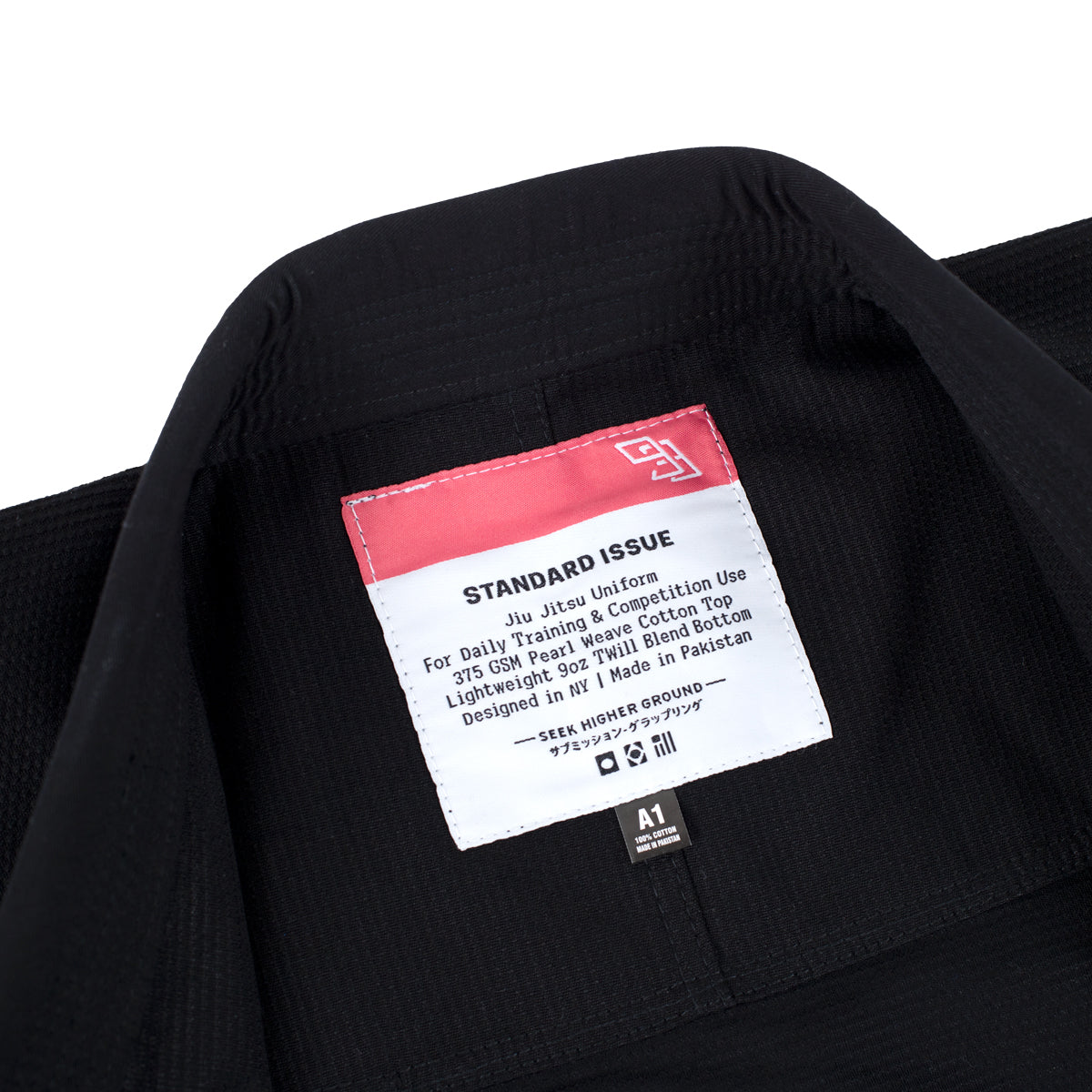 Standard Issue, part two! Slightly lightly fabrics, but with some upgrades. Thoroughly preshrunk and washed, meaning shrinkage will be on par with our higher-end BJJ Gis. The new weaves are a touch lighter on the scales, but more tightly woven and significantly more resistant to shrinkage... plus the extended knee panel and doubled up skirt paneling will ensure your Standard Issue is still plenty ready for hard sessions. And, of course, we kept it all crispy clean: Black fabrics and black stitching