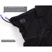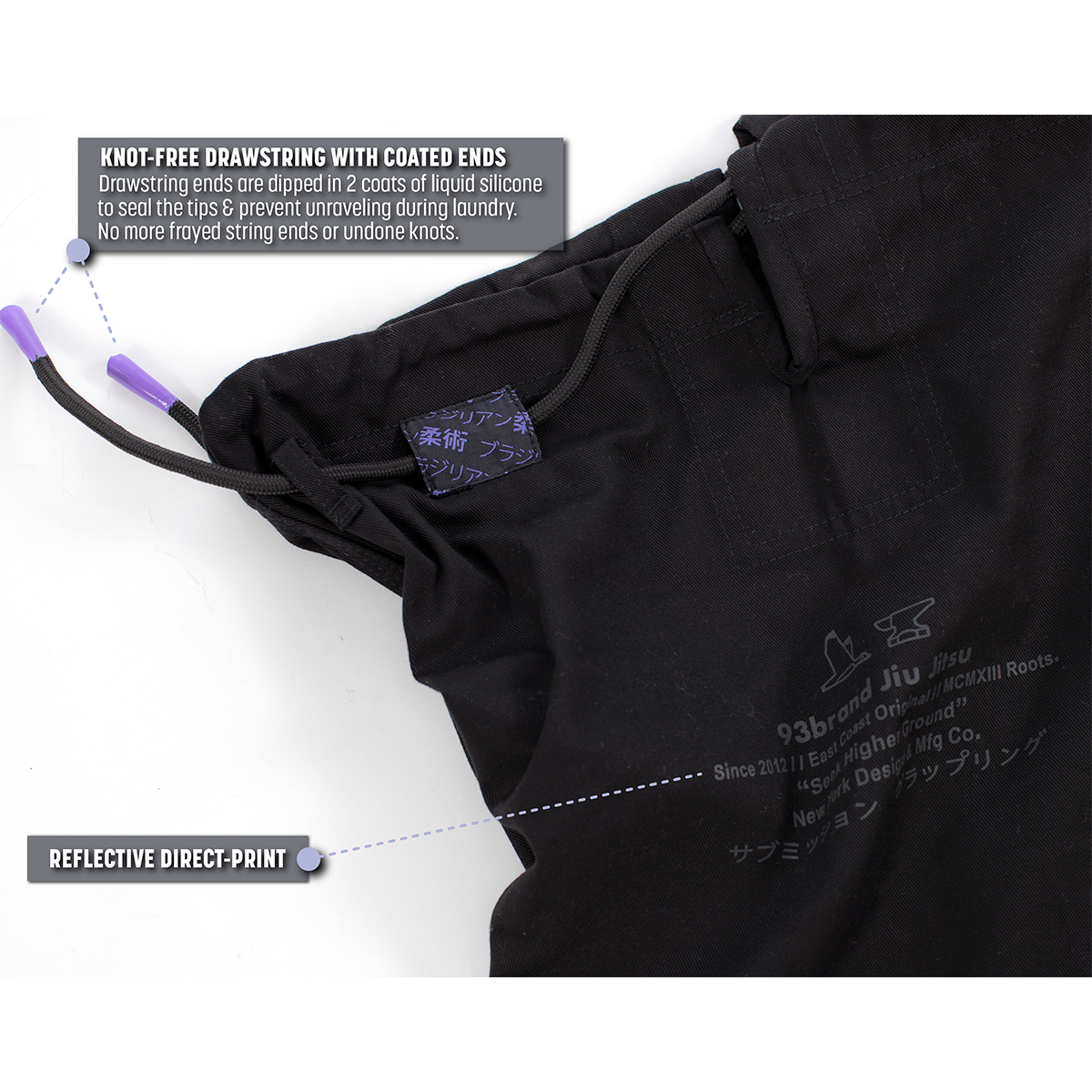We've always wanted a work-around for the conventional knotted drawstring. To avoid having to retie it, and just to clean up the look of the pant. But removing the knot and/or burning the ends of the string means that your string might get lost inside your waistband during laundry. So we've double-dipped our drawstring ends in a durable silicone, adding a splash of color while we're able to both 1. Remove the old school knot and 2. Prevent the string from coming loose in the wash.