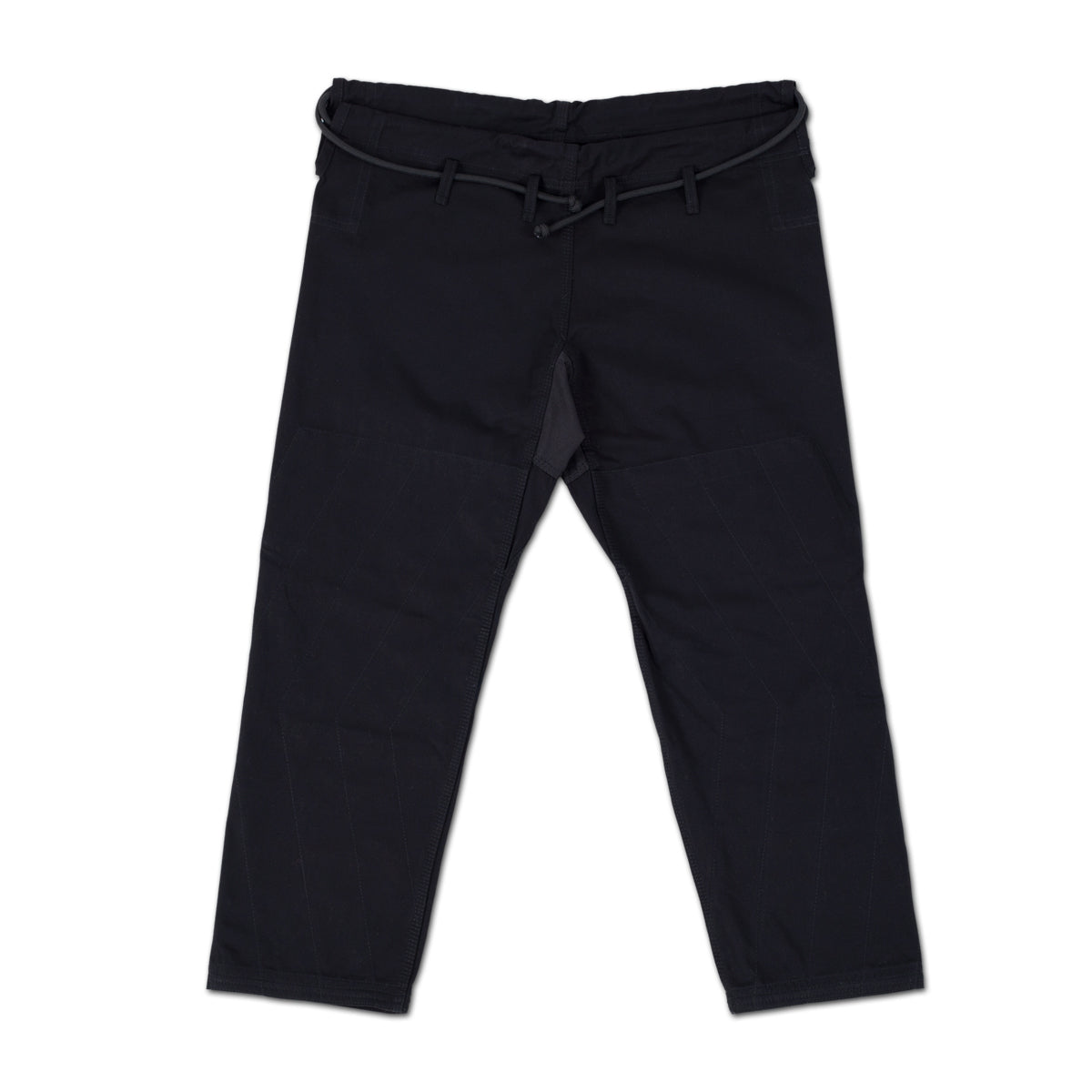 Standard Issue, part two! Slightly lightly fabrics, but with some upgrades. Thoroughly preshrunk and washed, meaning shrinkage will be on par with our higher-end BJJ Gis. The new weaves are a touch lighter on the scales, but more tightly woven and significantly more resistant to shrinkage... plus the extended knee panel and doubled up skirt paneling will ensure your Standard Issue is still plenty ready for hard sessions. And, of course, we kept it all crispy clean: Black fabrics and black stitching.