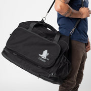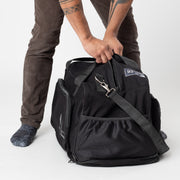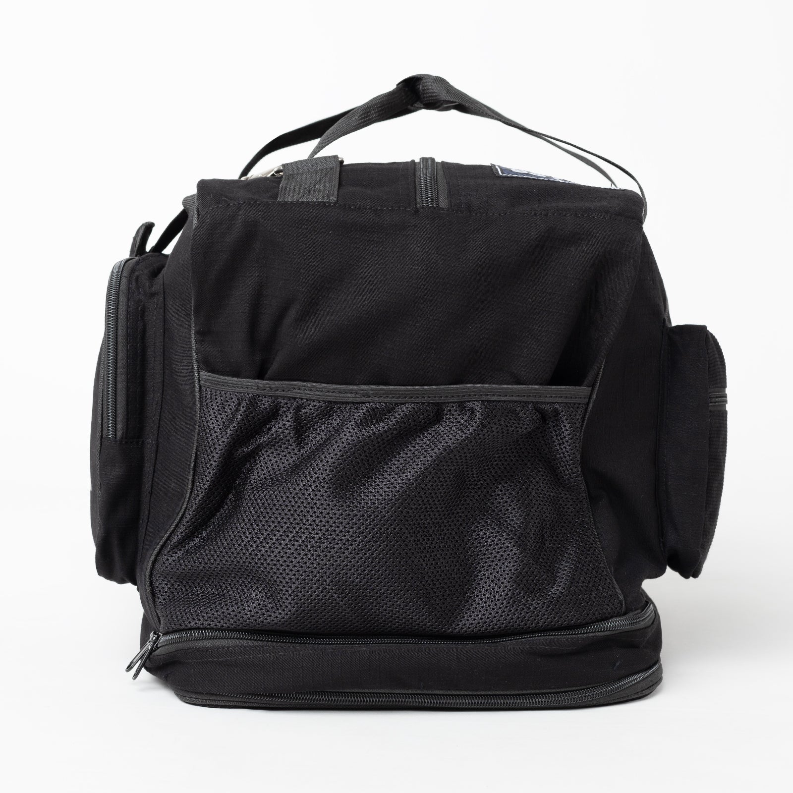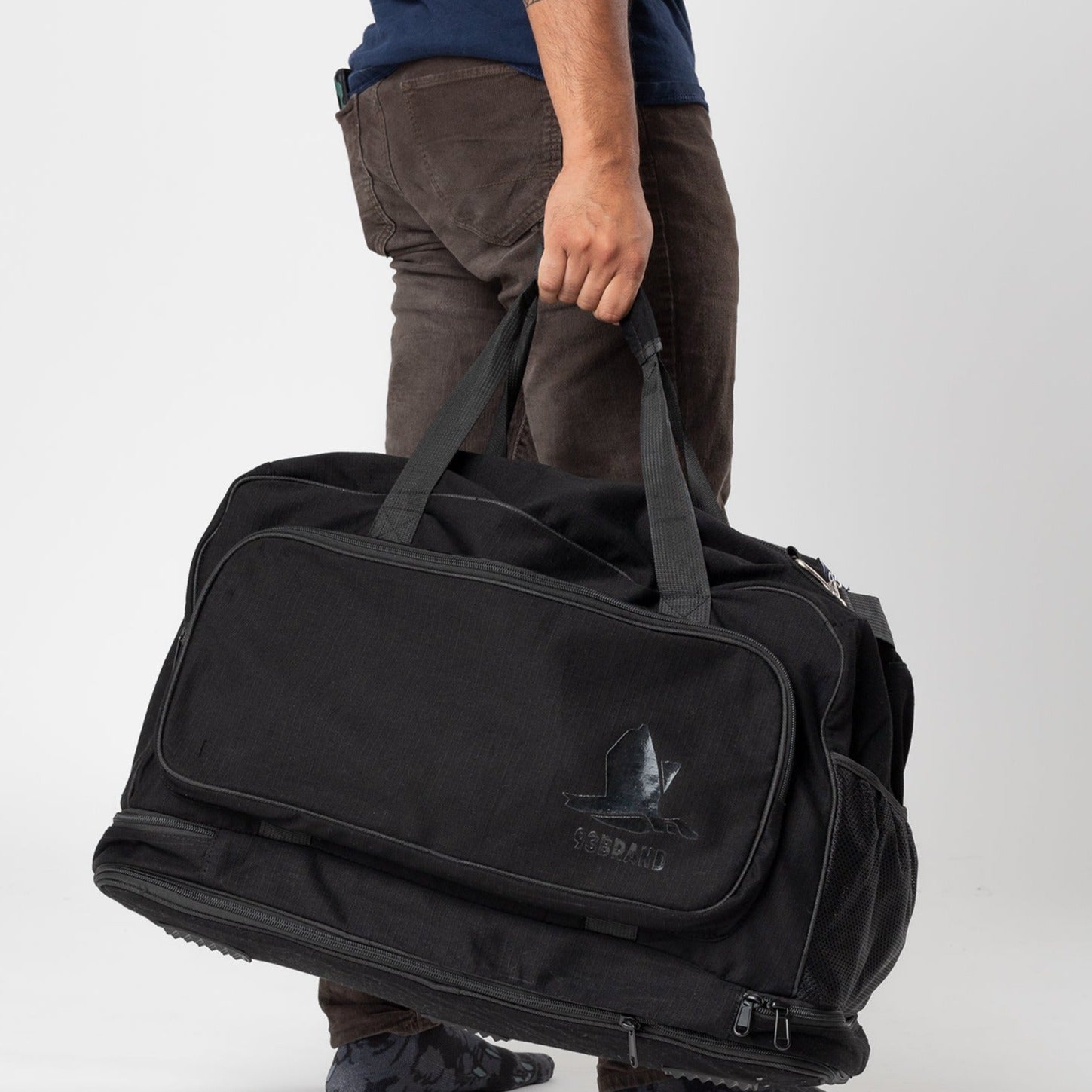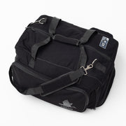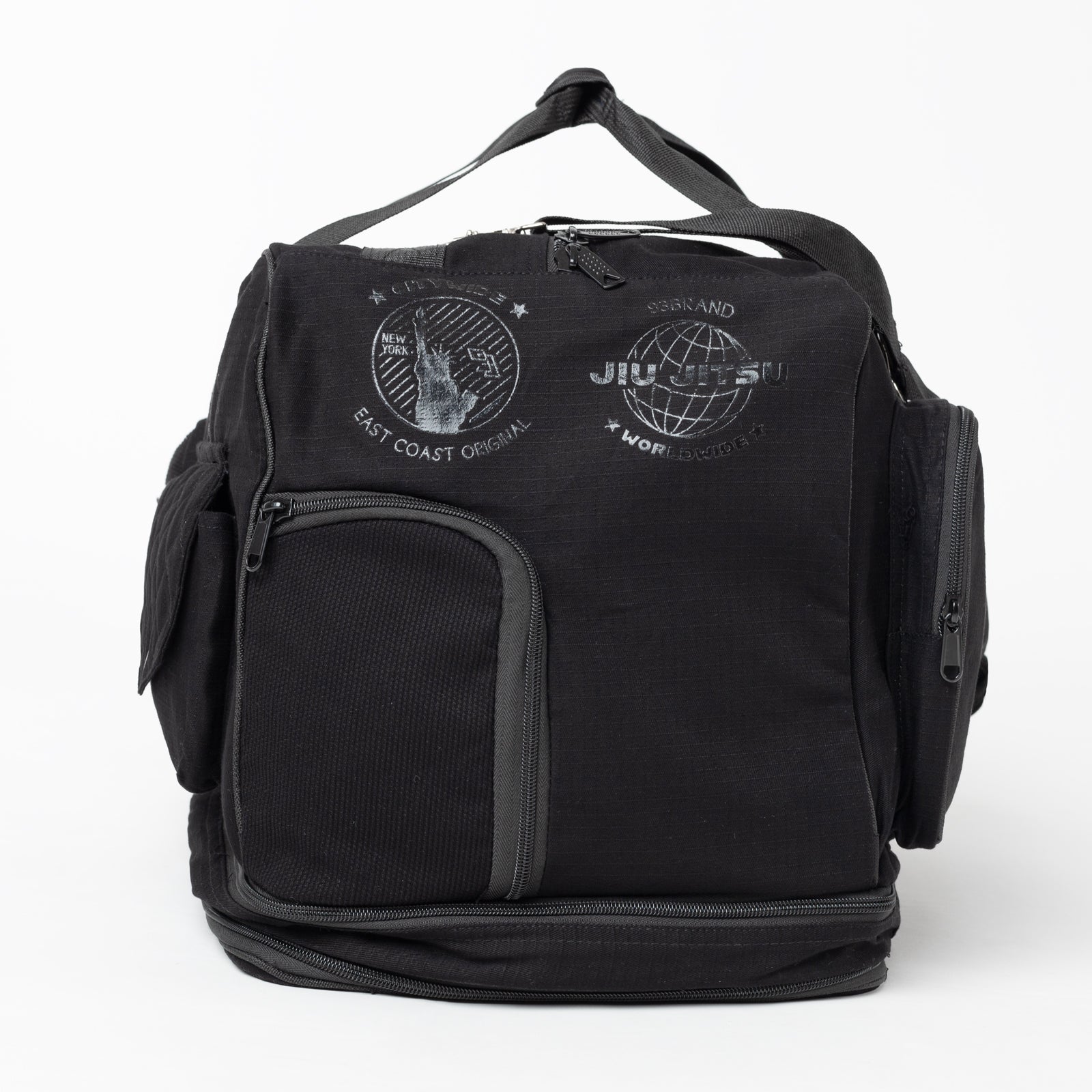 Our new blacked out duffle makes an ideal gym bag. The cotton construction allows for safe cleaning. We recommend securing all the straps and removing the shoulder strap prior to machine washing (and recommend washing it on its own). Cold wash, hang dry or tumble dry low. Keep it fresh just like your gis. Dimensions: 21" L x 15" W x 14" H"