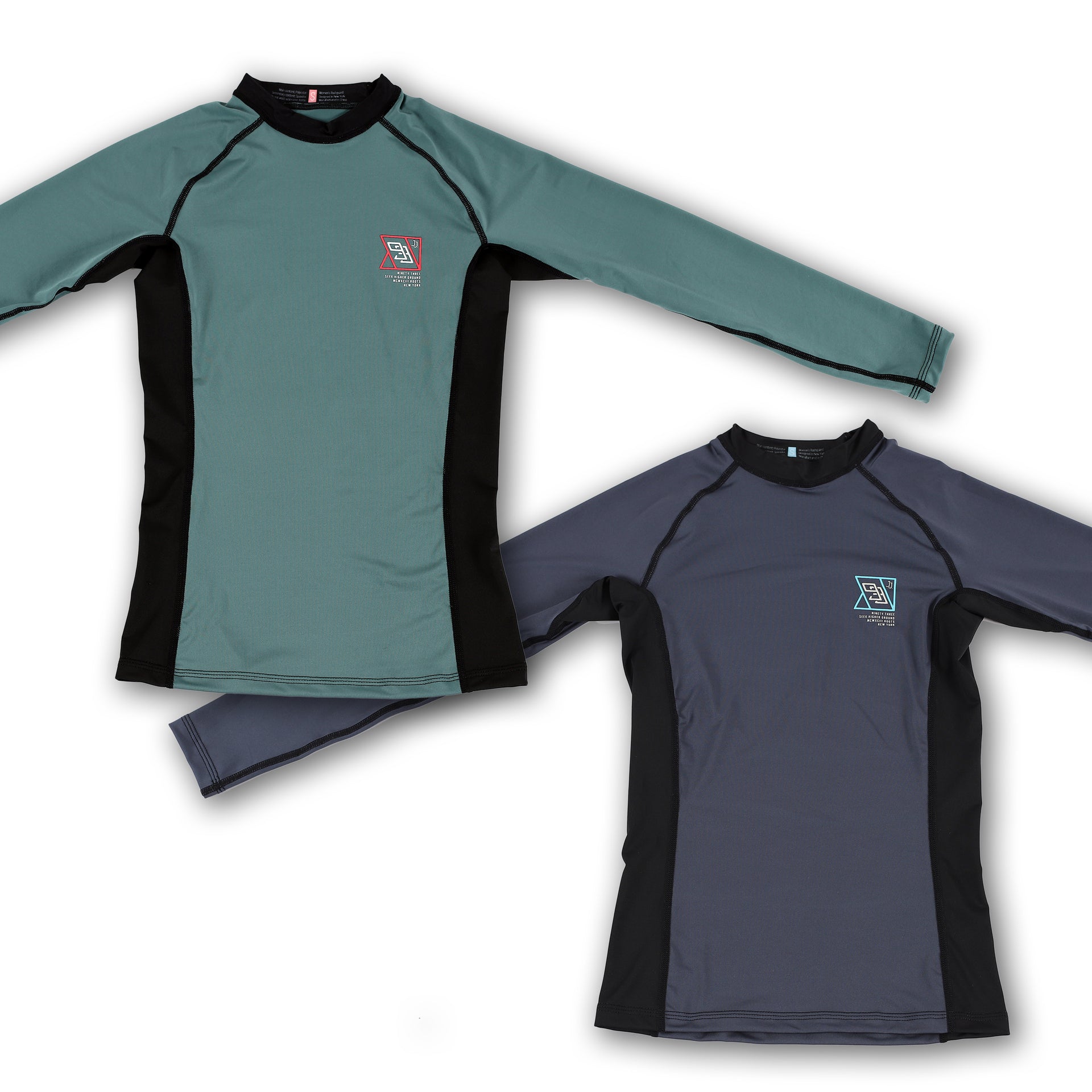 Set includes one sage green/black rash guard and one slate grey/black rash guard.