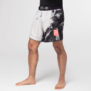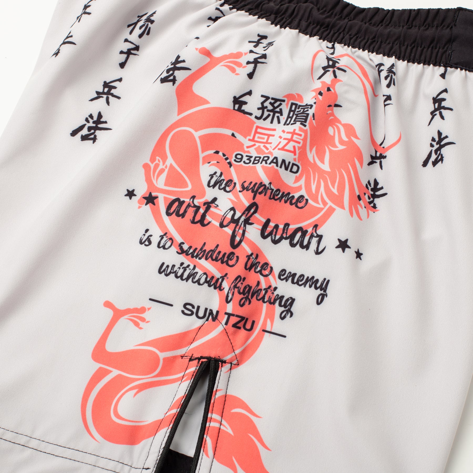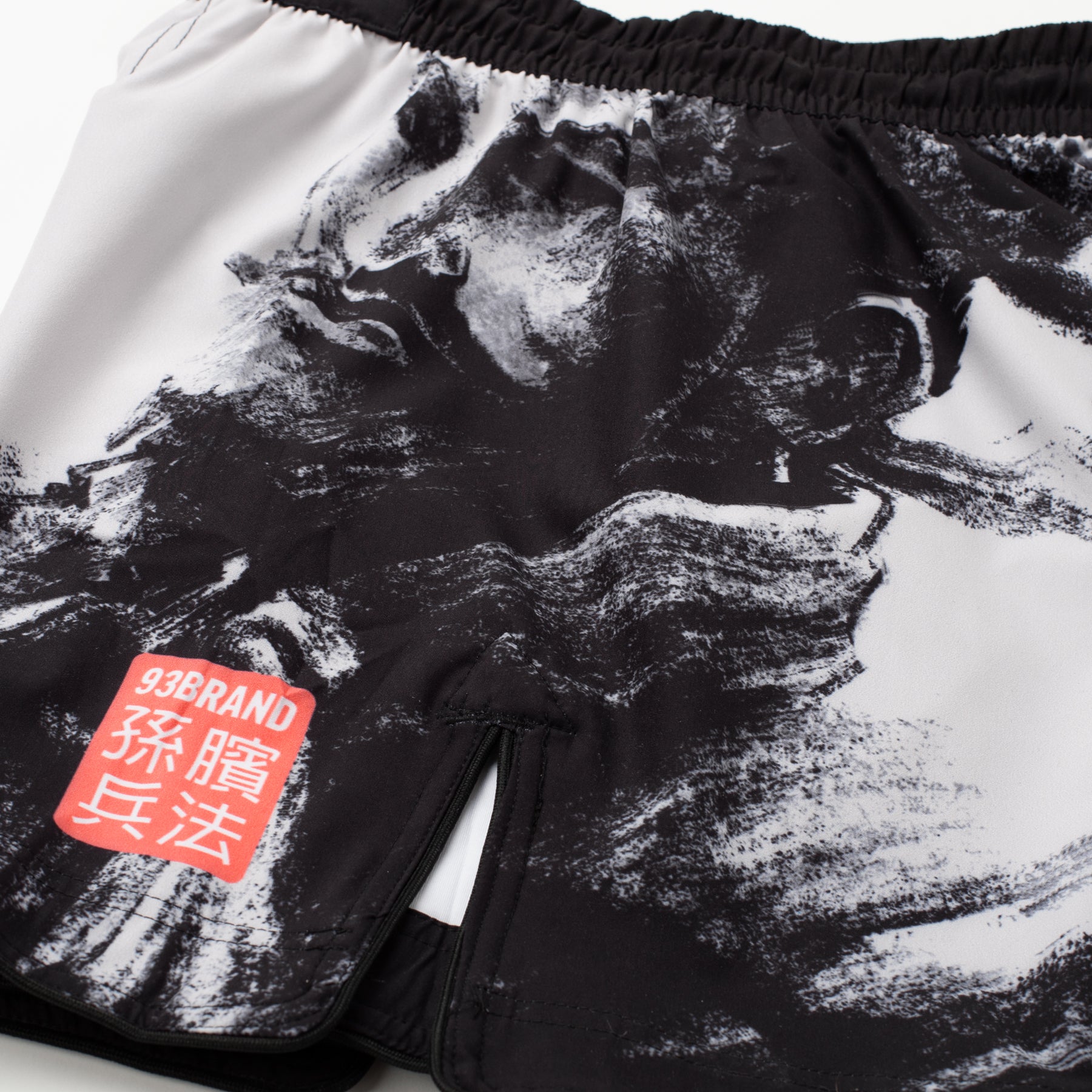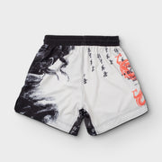 The overall design features an off-white base with bold graphics and branding that are fully sublimated into the material.  The crotch gusset panel is made of a stretch fabric for added flexibility and sports a contrasting white repeating kanji design.  Split side vents and lightweight materials contribute to the overall light and flexible feel.