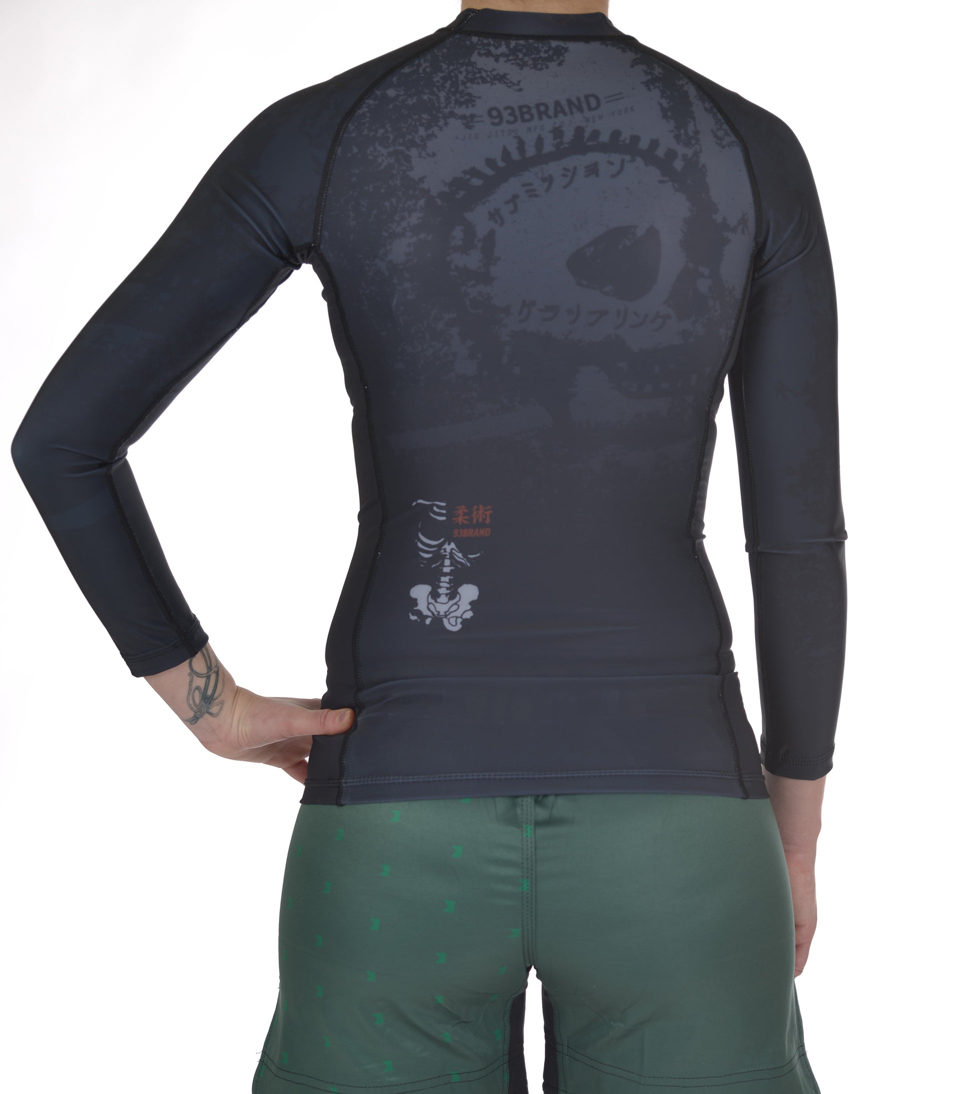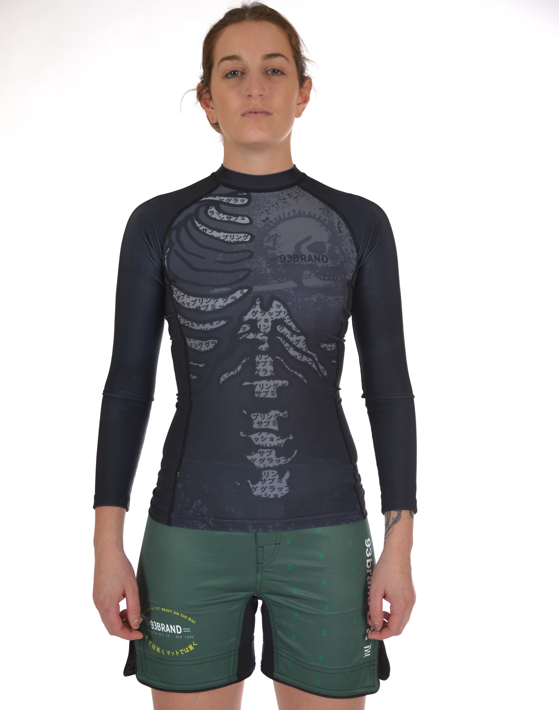 Black and textured dark grey artwork, all original illustrations. Assembled with flexible flatlock stitching and a generous torso length to prevent riding up while rolling.