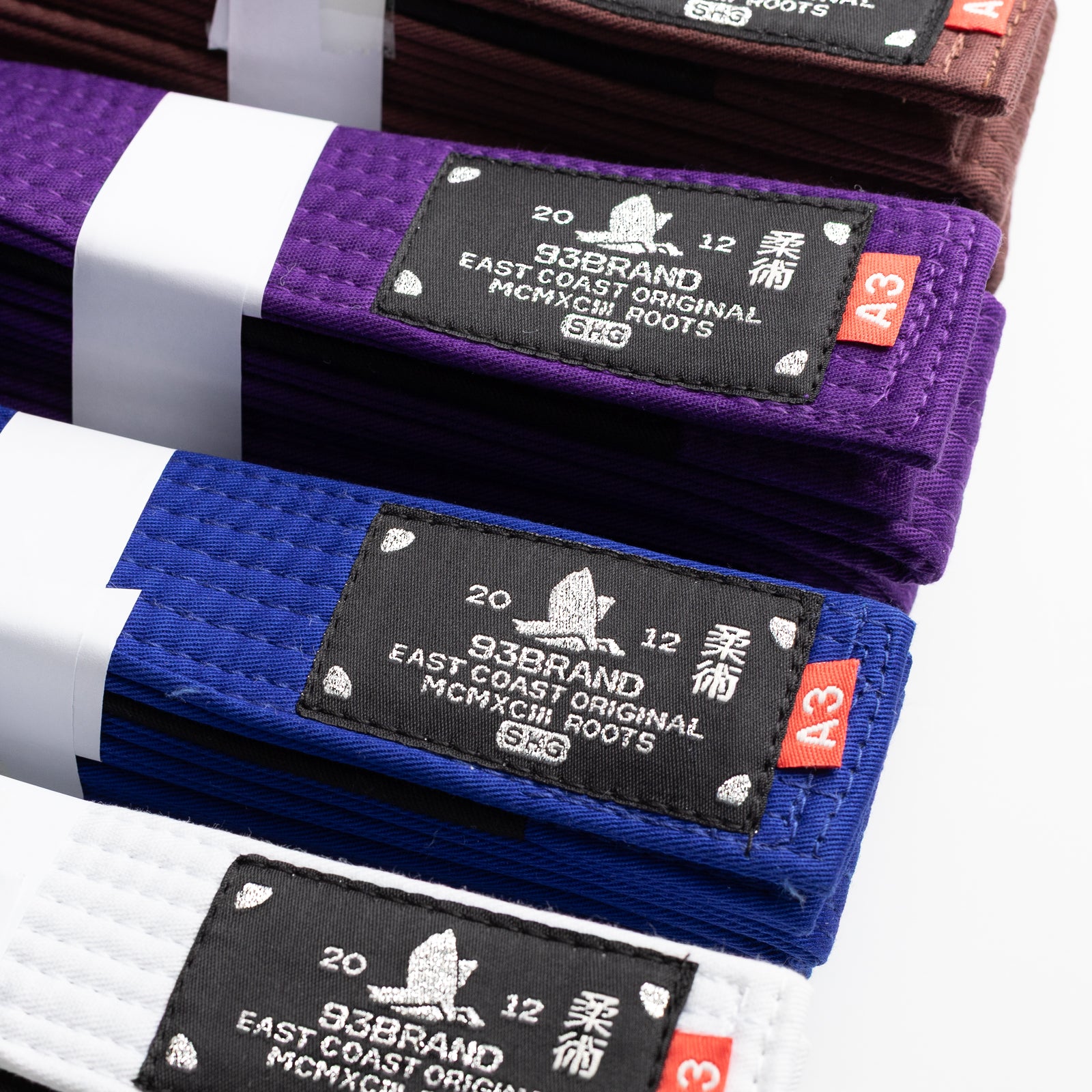 Classic Brazilian Jiu Jitsu belts from 93brand, built from ultra durable cotton with tight stitching. No over-the-top logos or extra tags, just a simple black & white label sewn at one end. The standard rank bar is located at the other end, with plenty of room for stripes. The resistant design will hold up over time, breaking in just enough over time.