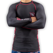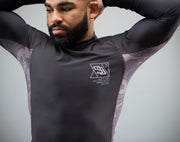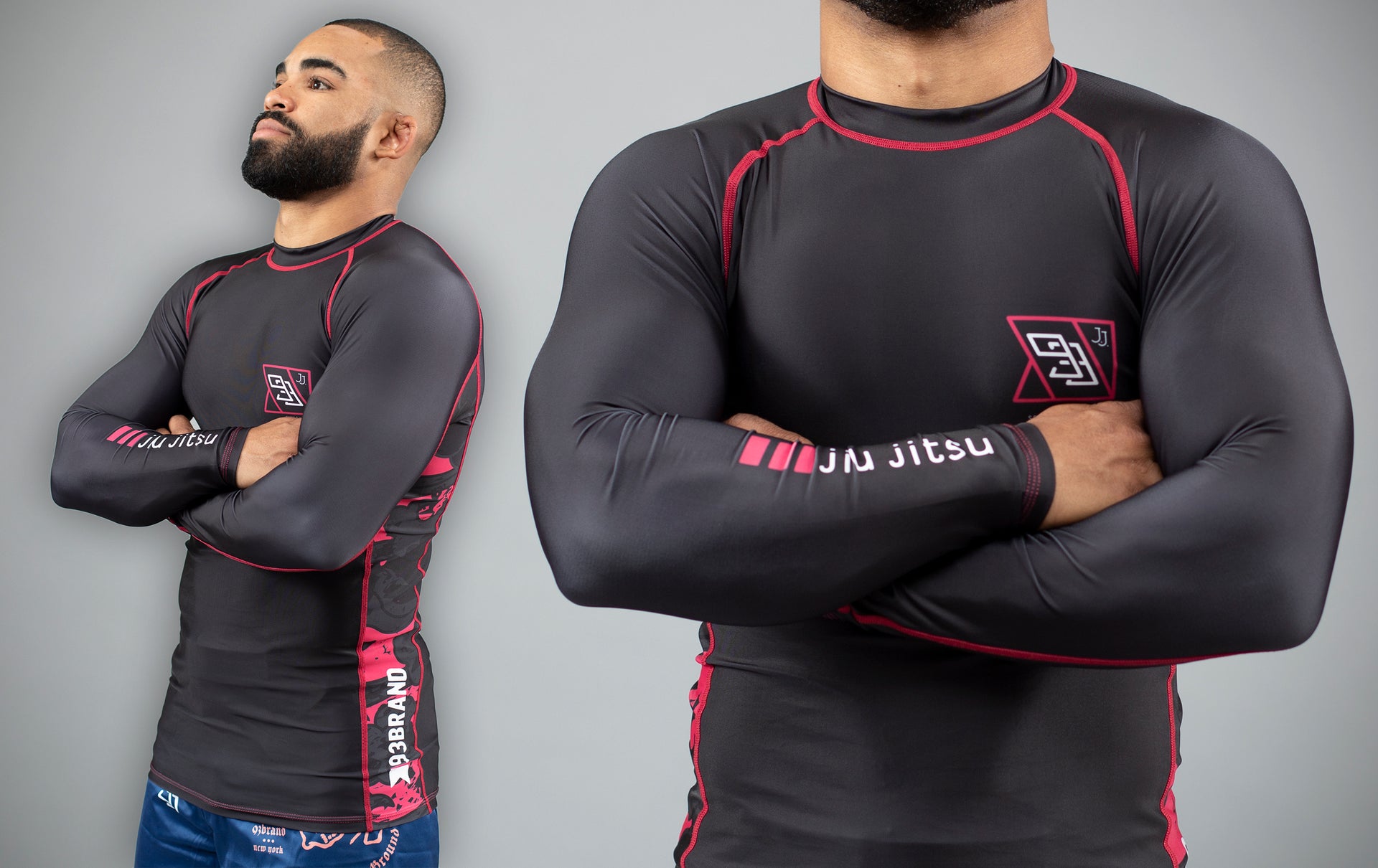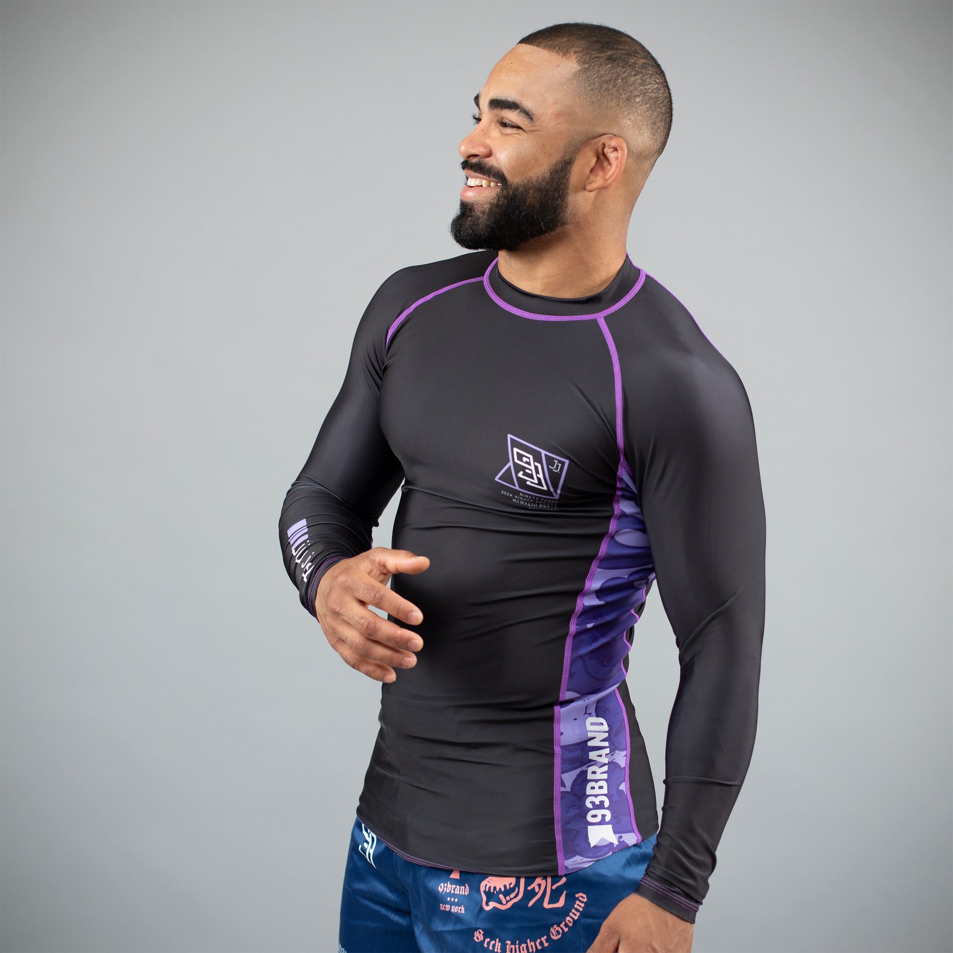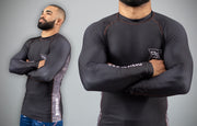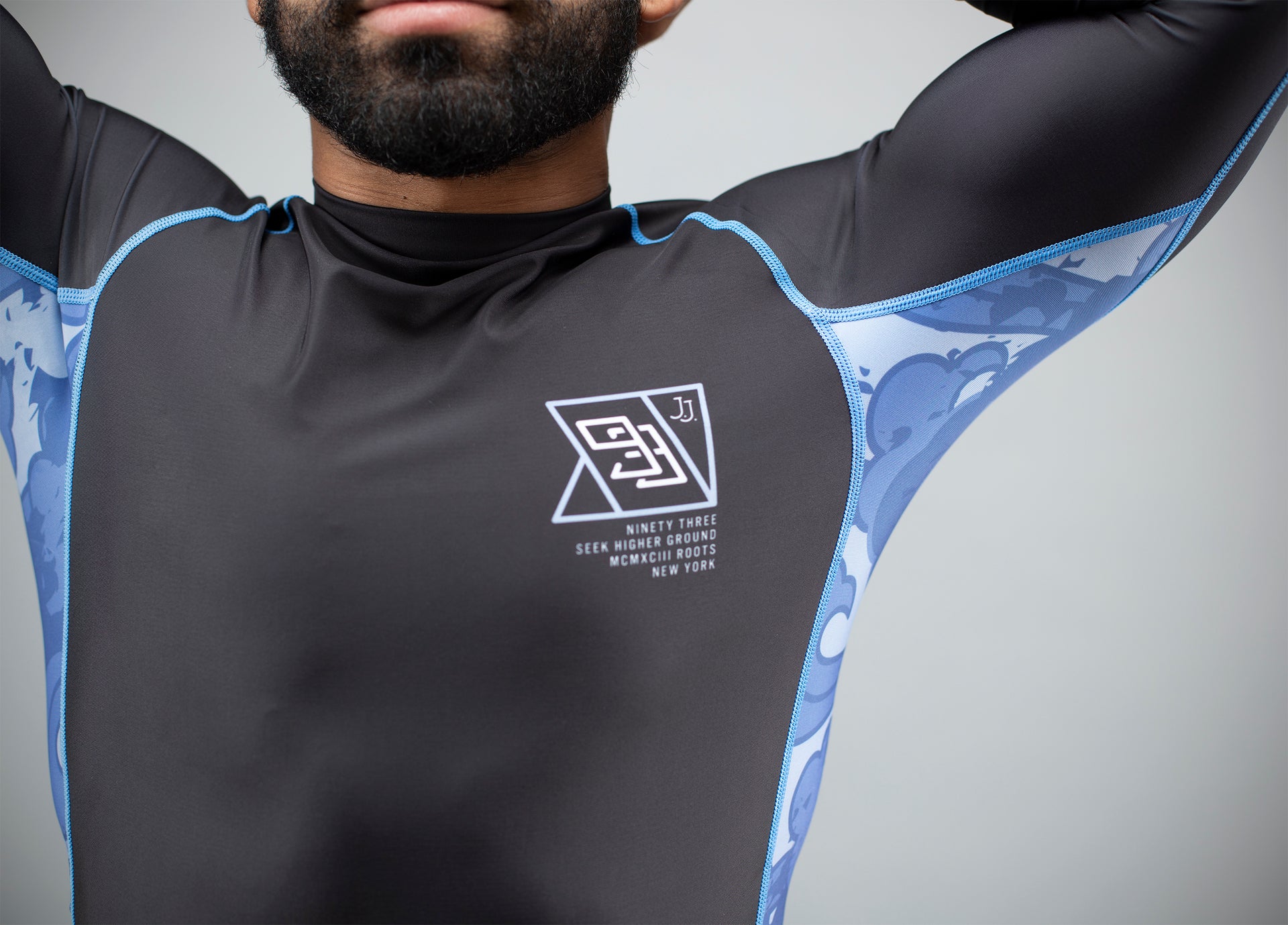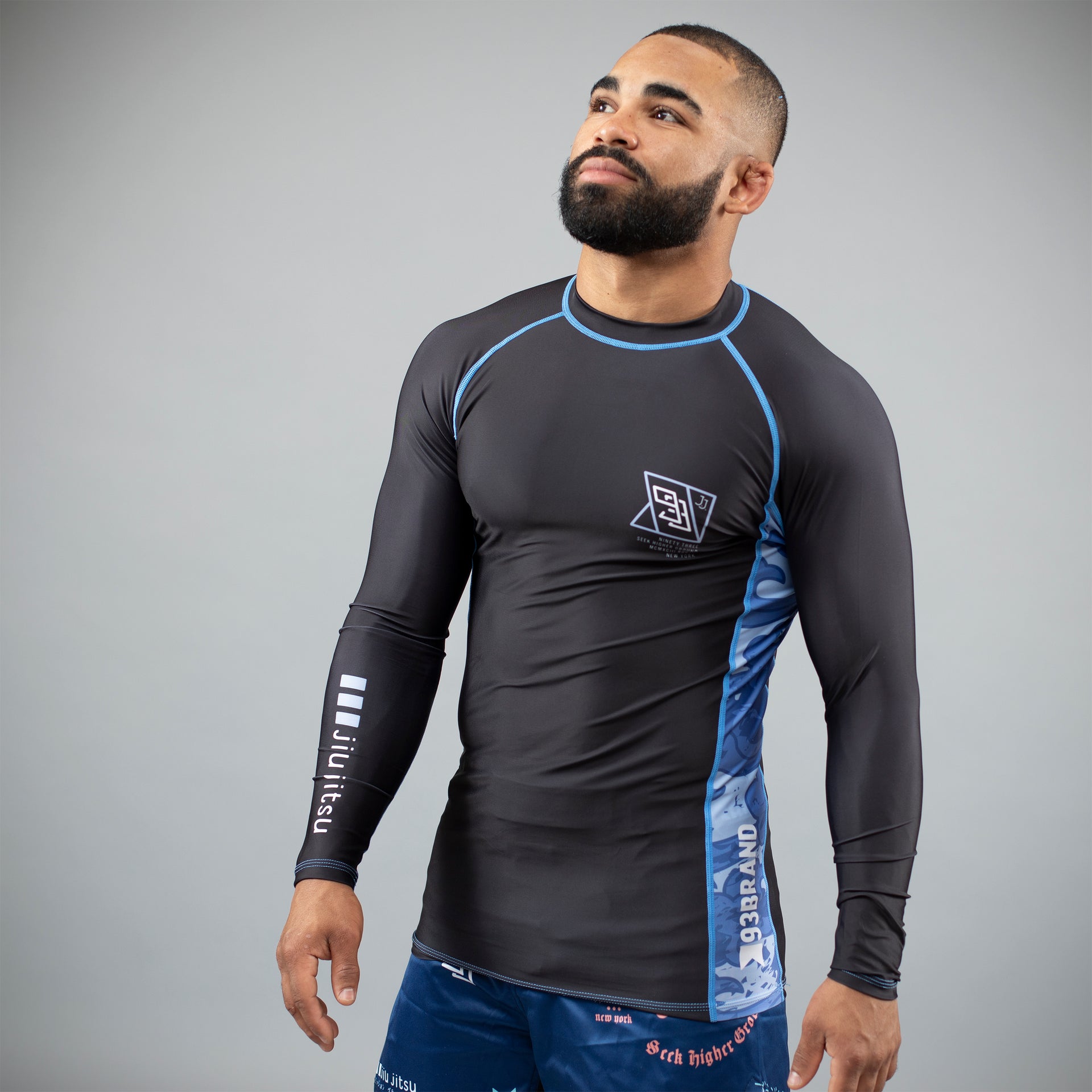 Official ranked rashguards, IBJJF approved. Black base with a subtle splash of oru custom "wind" camo along the side panels. Contrast stitching in your rank color.
